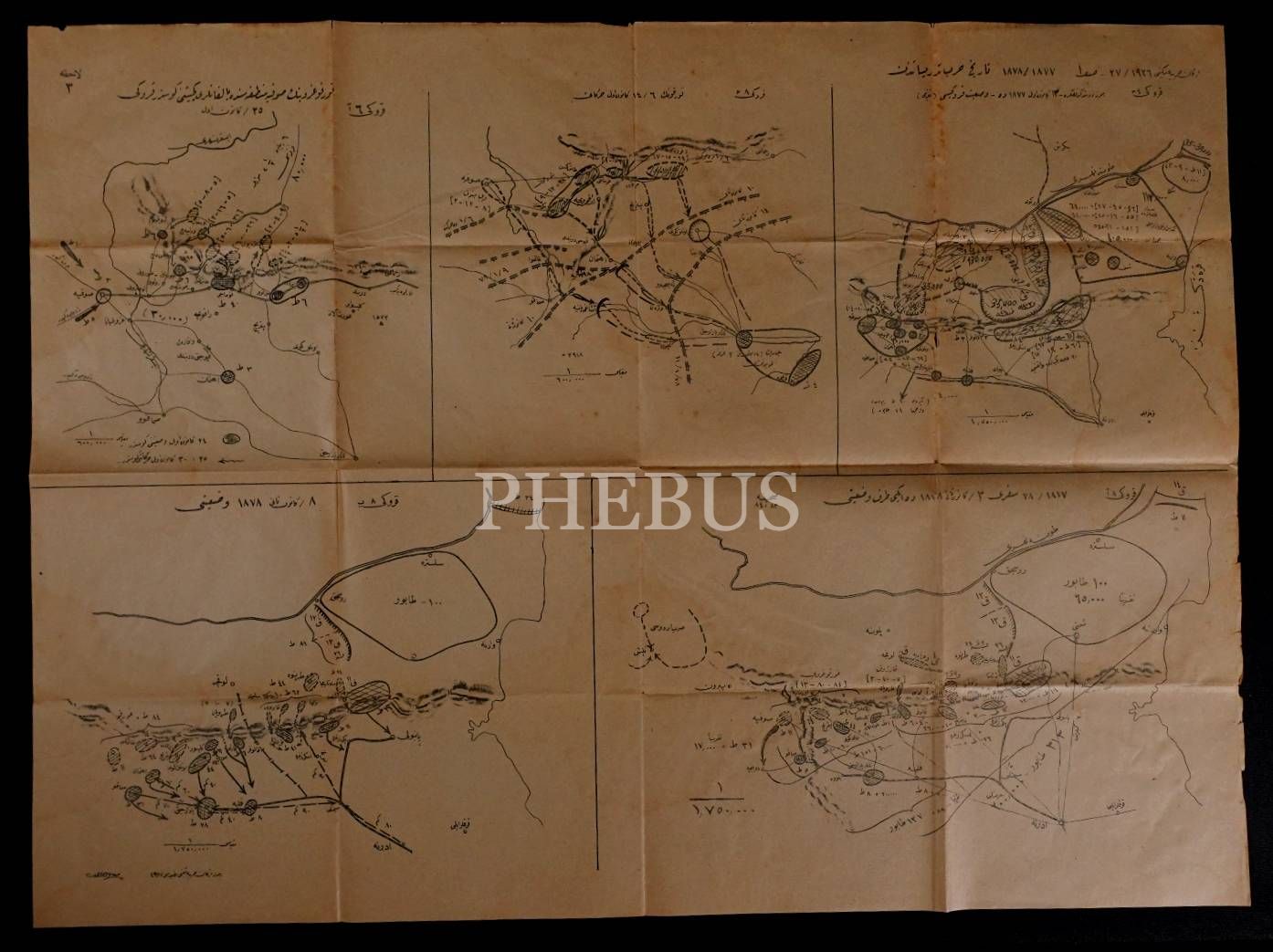 Balkan Harbi´nde Silistre ve Sofya mevkilerinde Türk ve Bulgar ordularının vaziyetini gösteren 5 adet Osmanlıca askeri kroki, 66x50 cm...