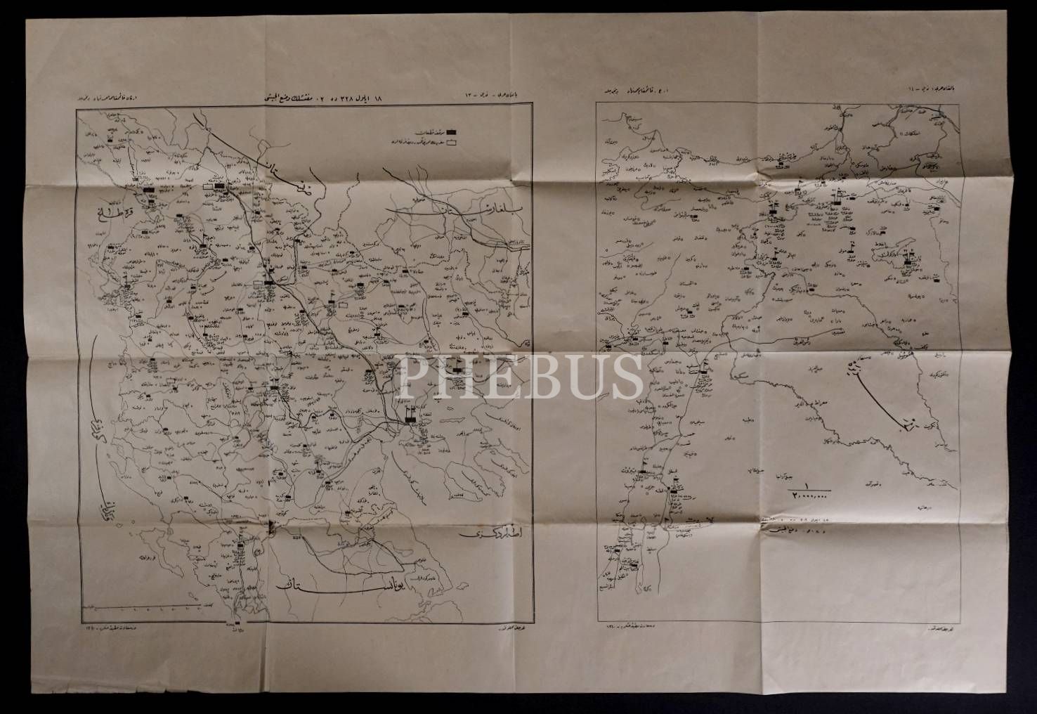 Balkan Harbi´nde El-Cezire, Sırbistan, Yunanistan ve Bulgaristan´da muvazzaf ve seferberlik almış Osmanlı birliklerinin vaziyetini gösteren 2 adet Osmanlıca askeri harita, Kaymakam Mehmed Nihad, Dersaadet Matbaa-i Askeriye 1340, 82x57 cm...