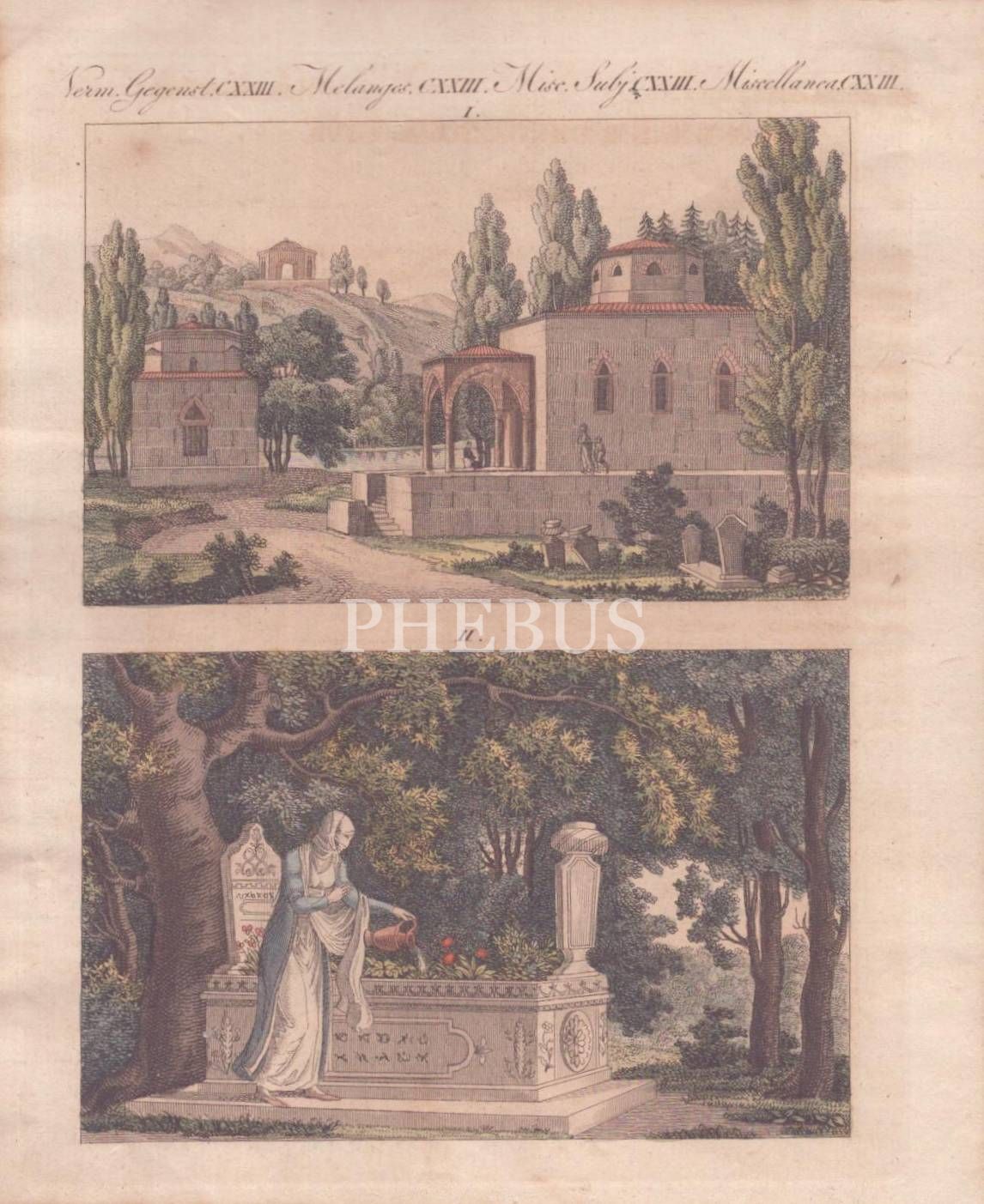 Türk türbesi ve mezarı konulu, elle renklendirilmiş bakır baskı gravür, Bilderbuch für Kinder (Çocuklar İçin Resimli Kitap), 1807, 20x24 cm...