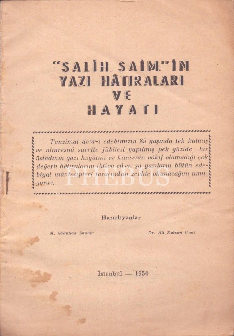 SALİH SAİM´İN YAZI HÂTIRALARI VE HAYATI, M. Sadullah Sander, Ali Rıdvan Unar, 1954, İstanbul Sulhi Garan Matbaası, 42 sayfa, 14x20 cm...