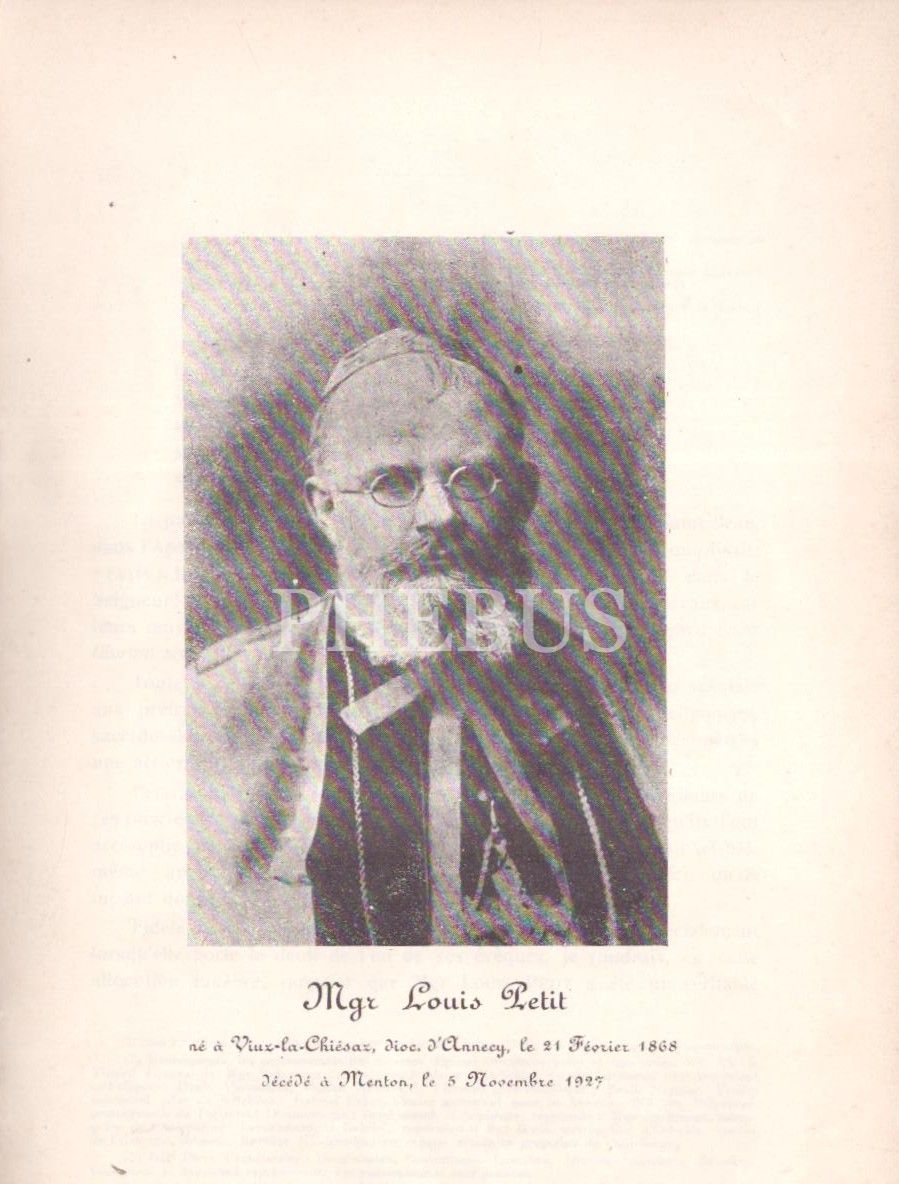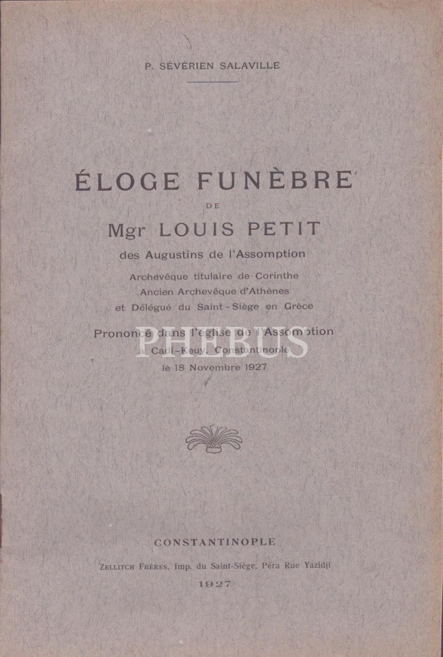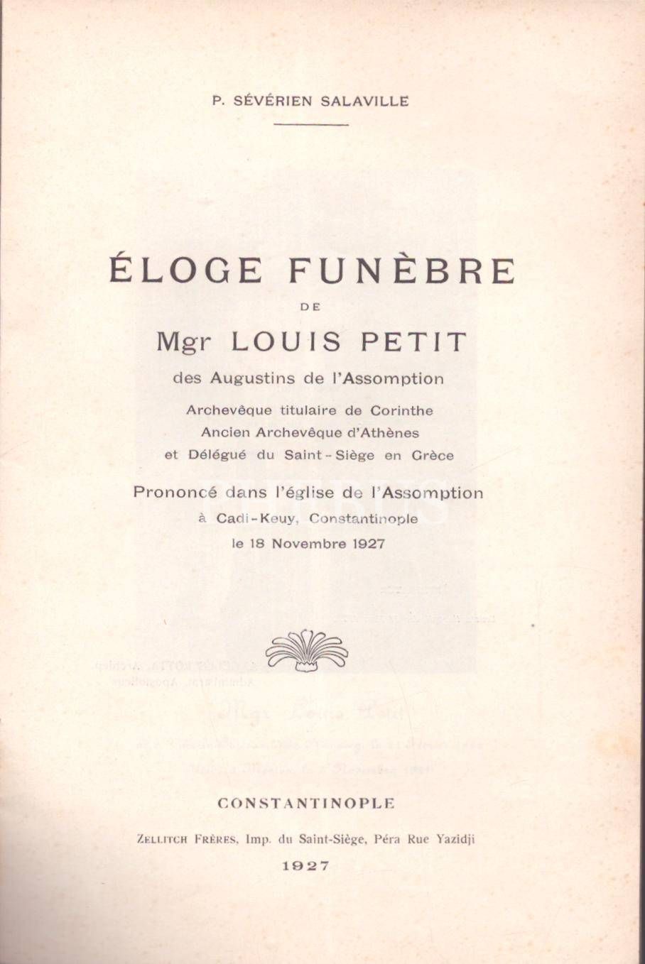 Kadıköy Moda´daki Notre Dame Katolik kilisesinden 1927´de verilen Mgr.Louis Petit´in konferans metni, "Eloge funebre de Mgr Louis des augustins de l´assomption, prononce dans l´Eglise de l´assomption a Cadi-keuy Constantinople",15 sayfa, 16x23 cm