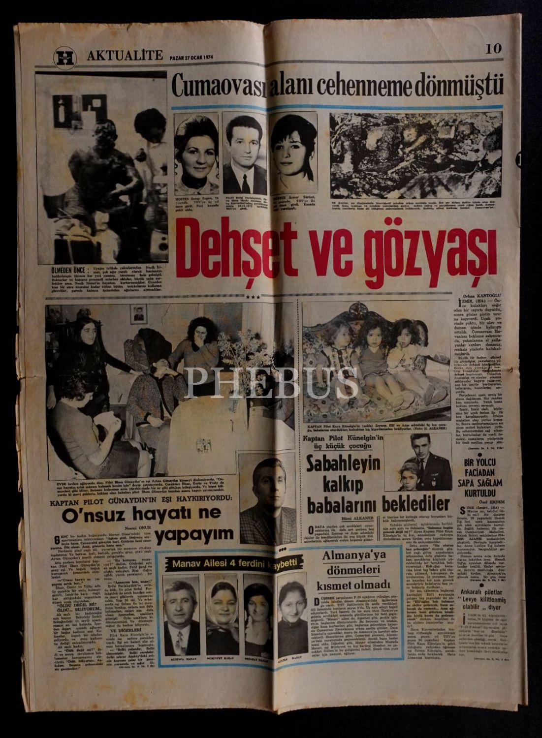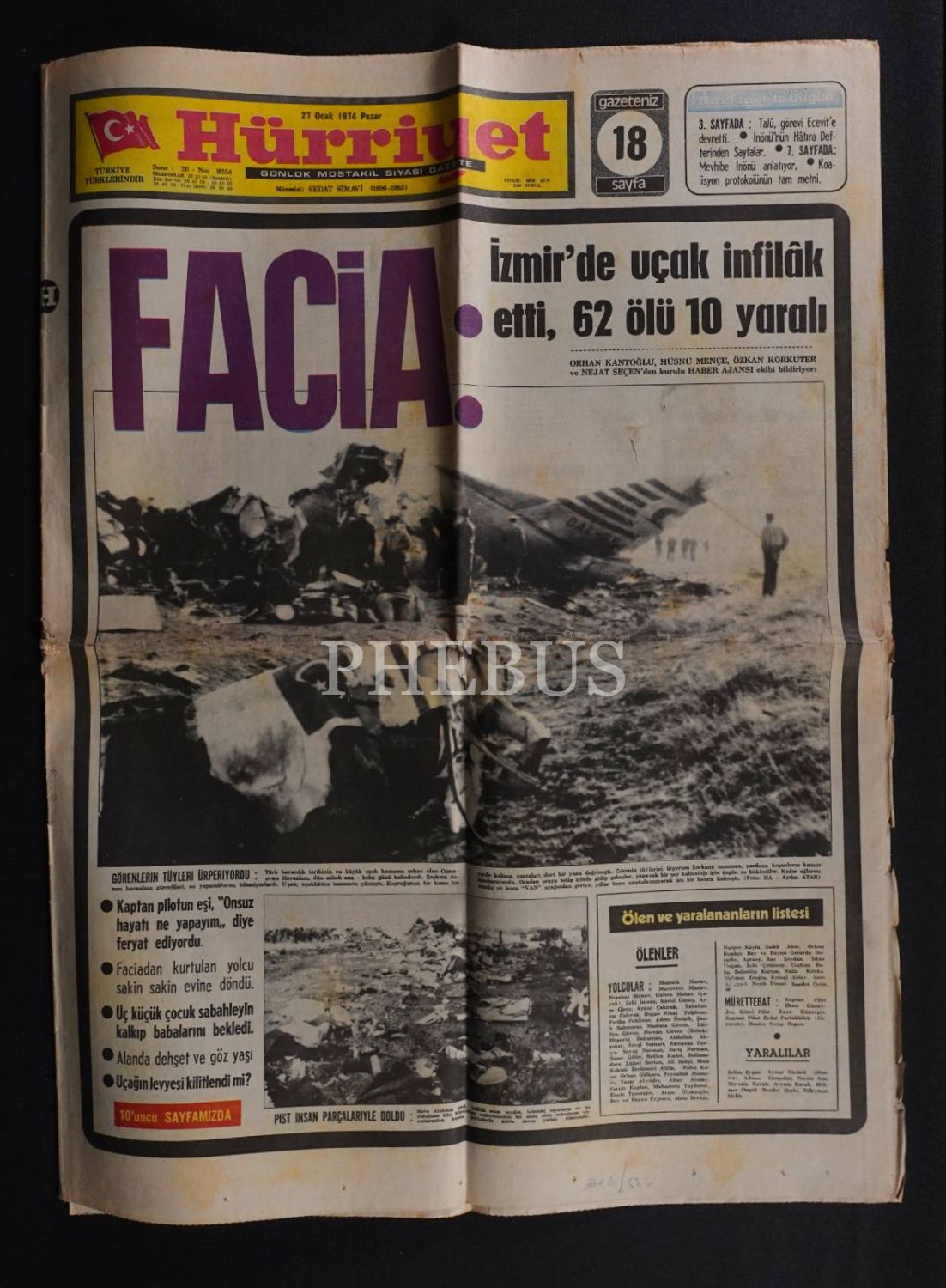 27 Ocak 1974 tarihinde İzmir´de gerçekleşen uçak kazasını manşetine taşıyan Hürriyet gazetesi, 10 sayfa, 43x58 cm...