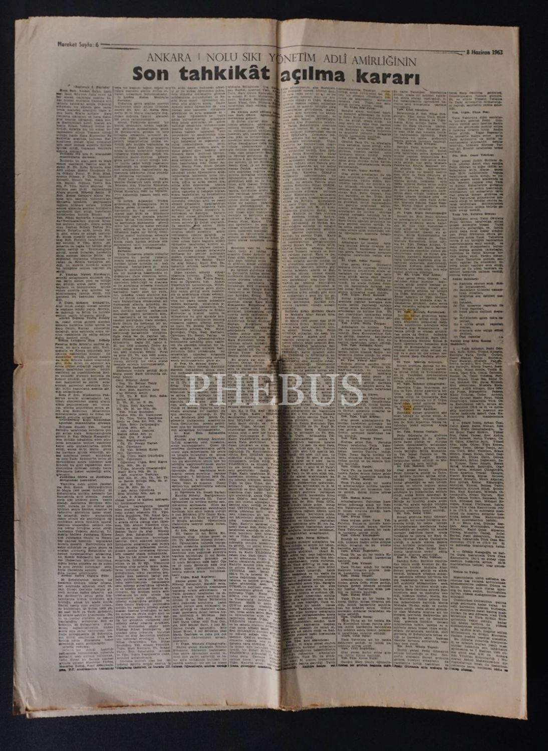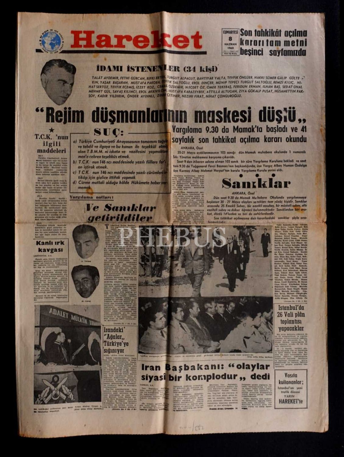 Talat Aydemir liderliğinde 20-21 Mayıs askeri darbe girişiminin sanıklarının yargılanması konulu Hareket gazetesi, 8 Haziran 1963, 6 sayfa, 43x58 cm...