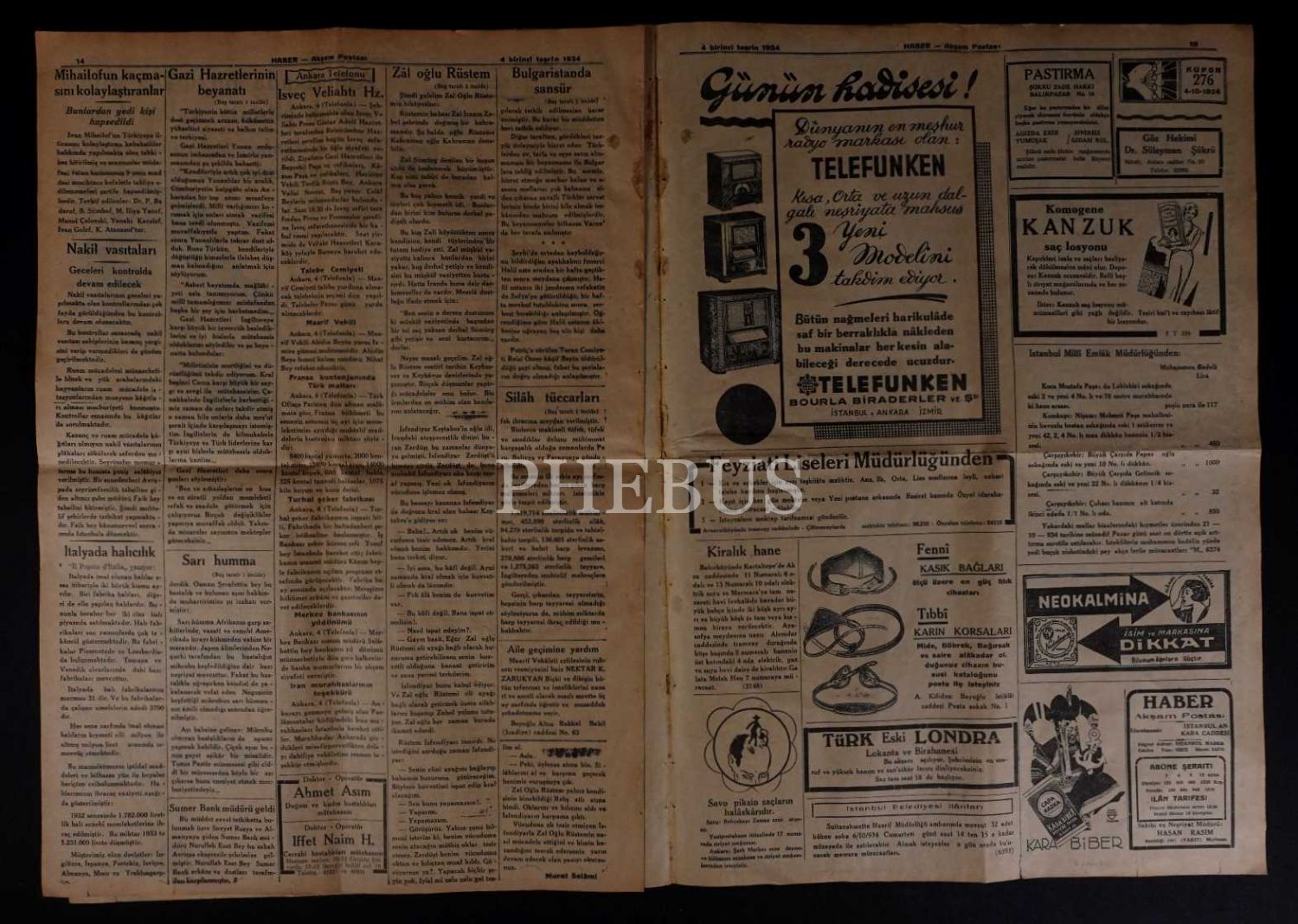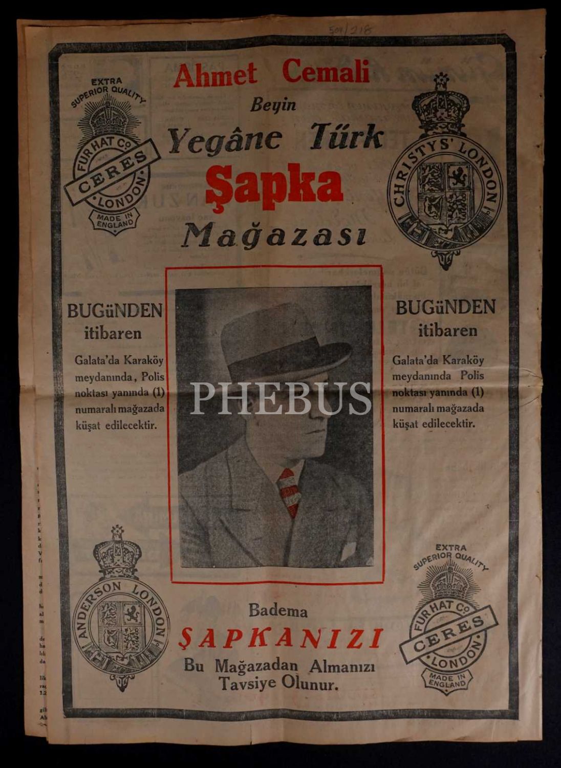 4 Birinci Teşrin 1934 tarihli Akşam Postası gazetesinin iç sayfaları, arka kapak "Ahmet Cemali Beyin Yegâne Türk Şapka Mağazası" reklamlı, 37x53 cm...