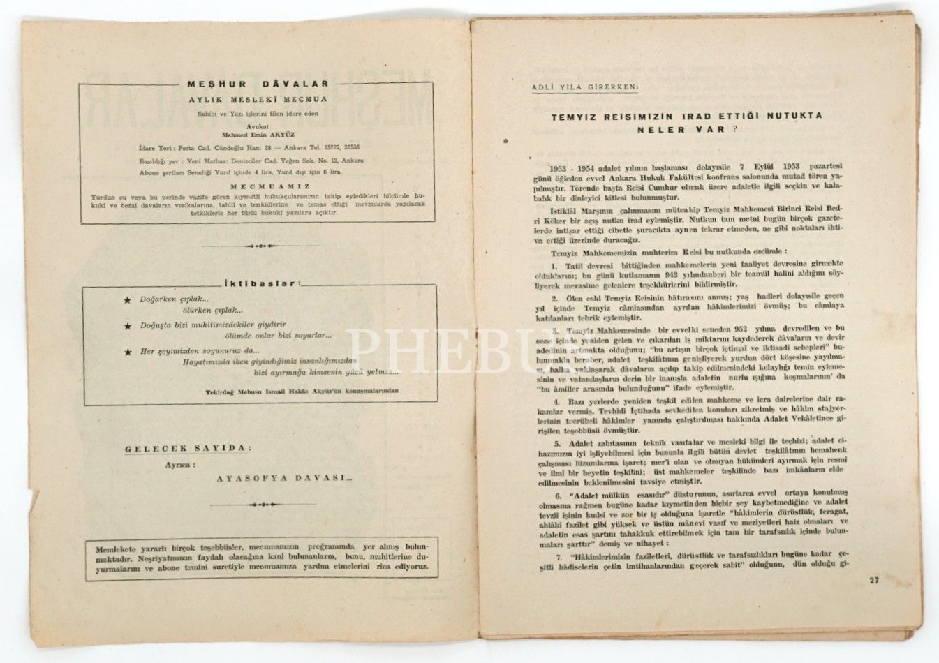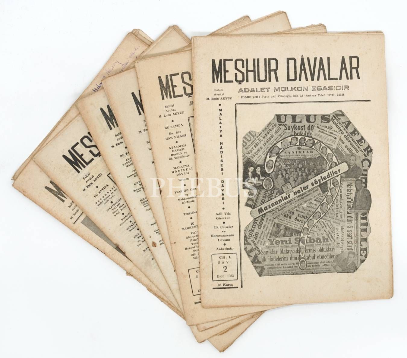 "Aylık Meslekî Mecmua" MEŞHUR DÂVALAR´ın 1953 yılında yayınlanan ilk 5 sayısı ile 1954 tarihli 7. ve 9. sayıları, 20x29 cm...