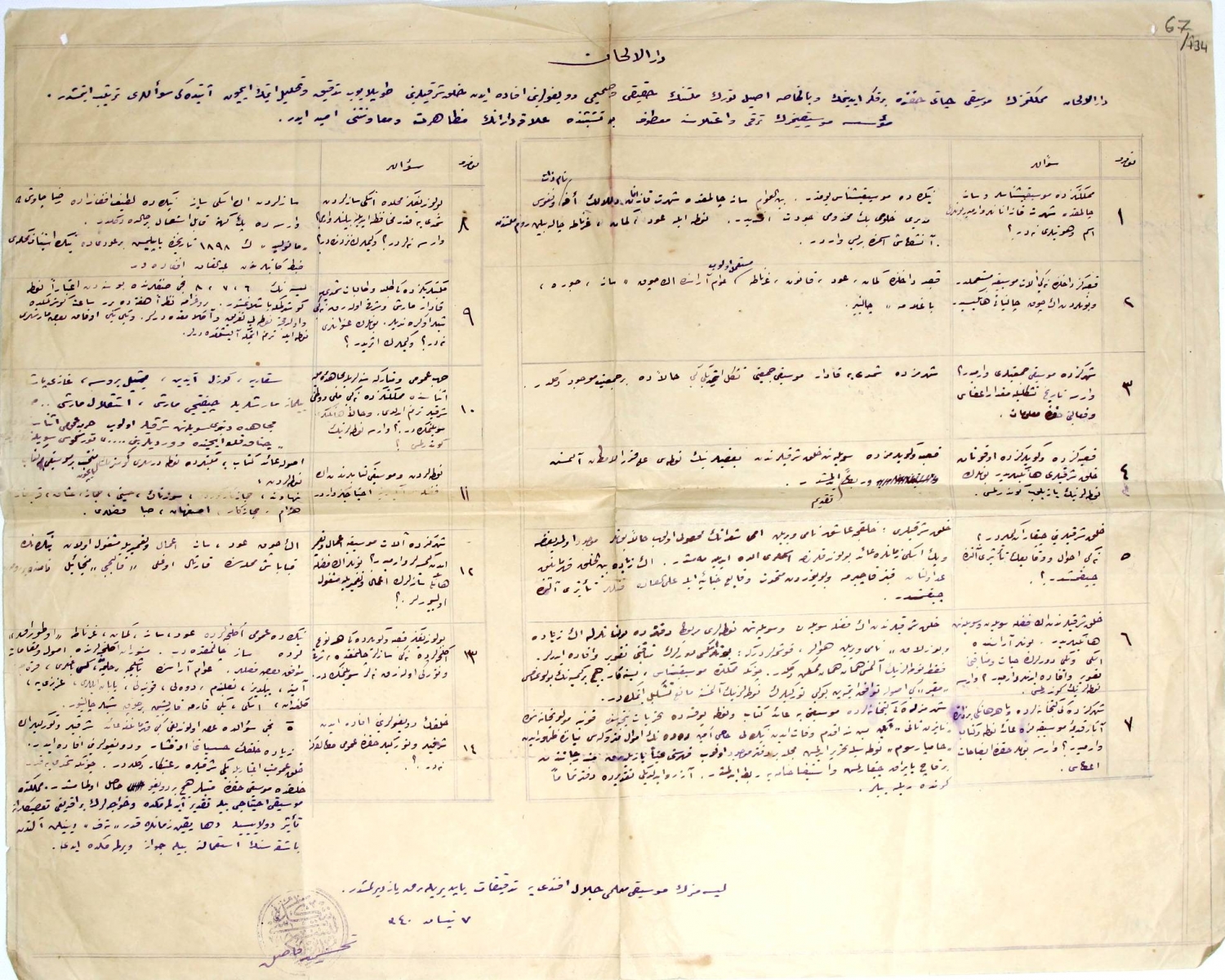 Osmanlı Niğde Lisesi Müdürü Tahsin Fazıl tarafından musiki muallimi Celal Efendiye hazırlatılmış Darülelhan Musiki cemiyeti hakkında soru - cevap listesi. Tahsin Fazıl imzalı, 1340 tarihli, 42x32 cm