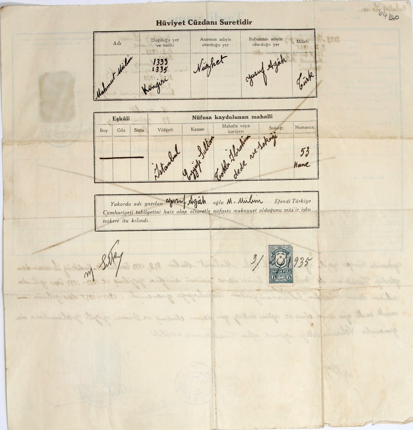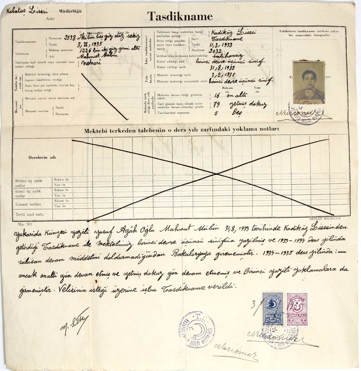 1933 tarihli Kadıköy Lisesi talebesine ait tasdikname, 32x33 cm