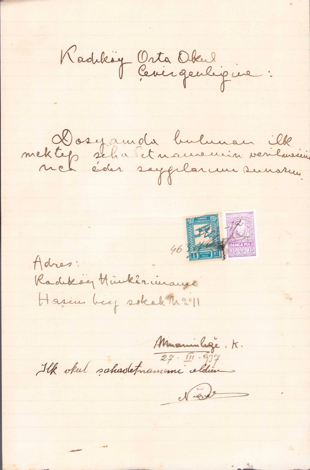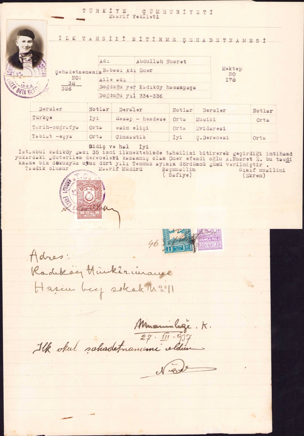 İstanbul Kadıköy Gazi 35 inci İlk Mektebi el yapımı şehadetname, 1937, 34x20 cm