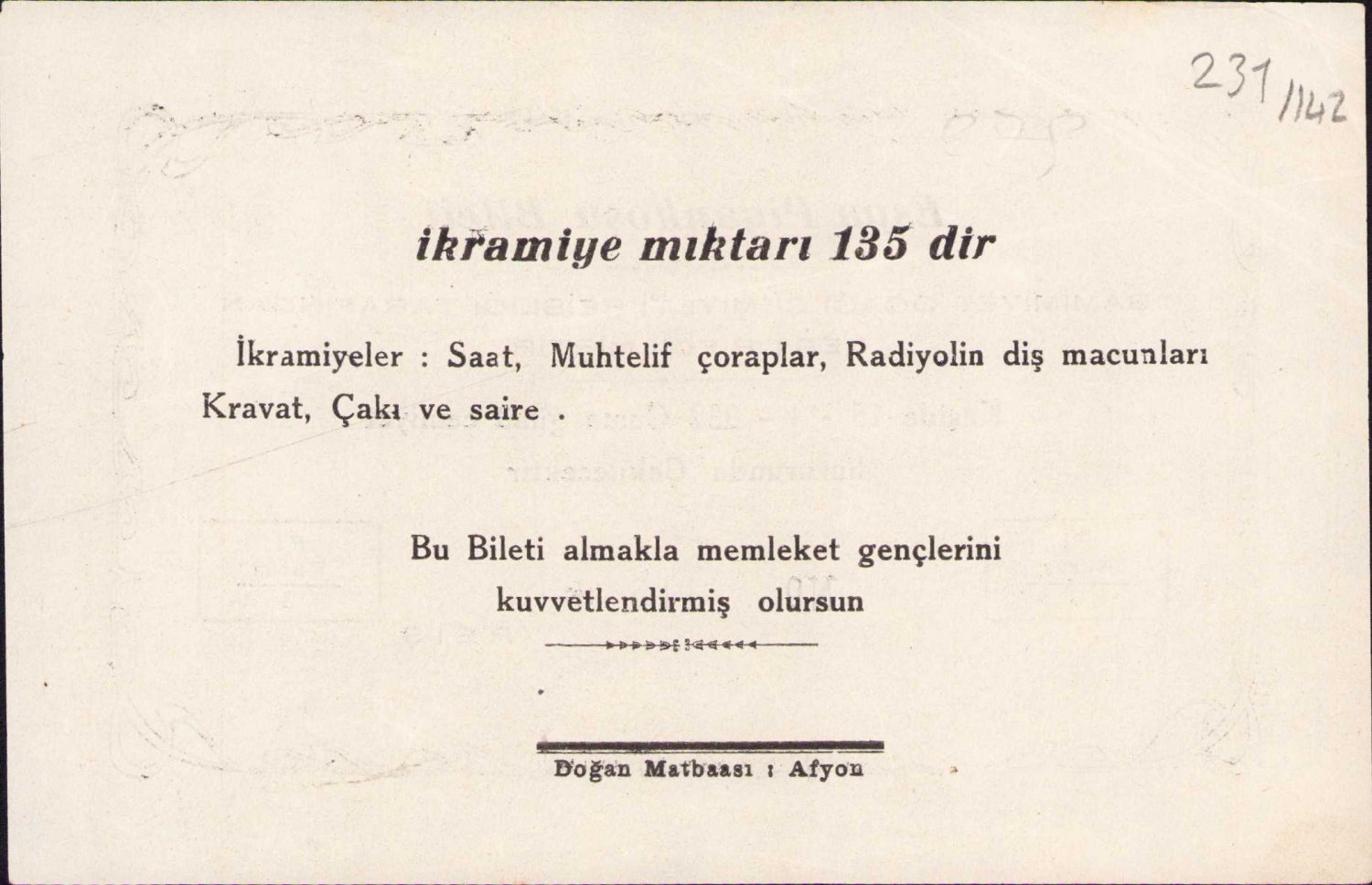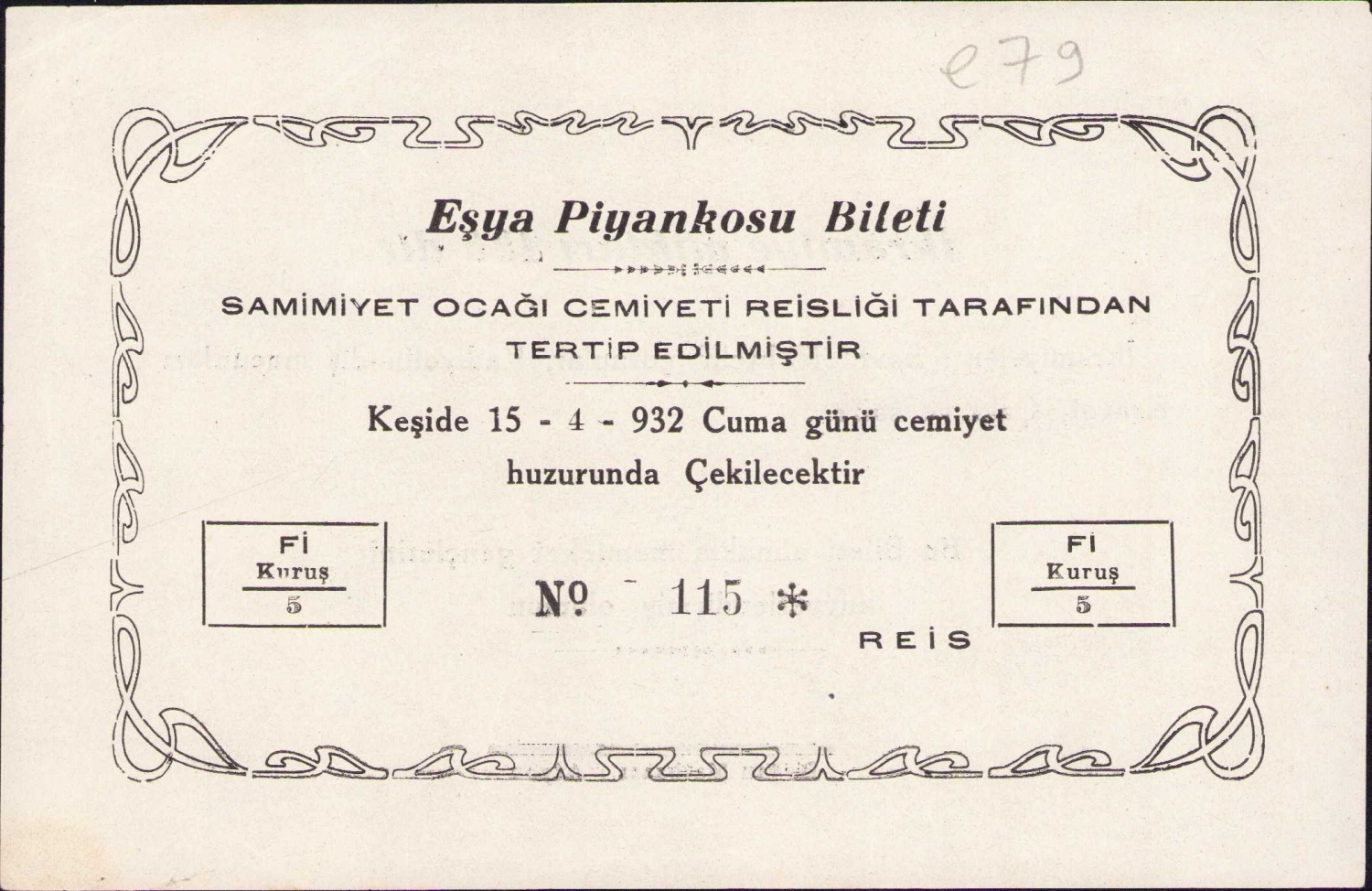 Samimiyet Ocağı Emniyet Reisliği eşya piyango bileti, 1932, 11x16 cm