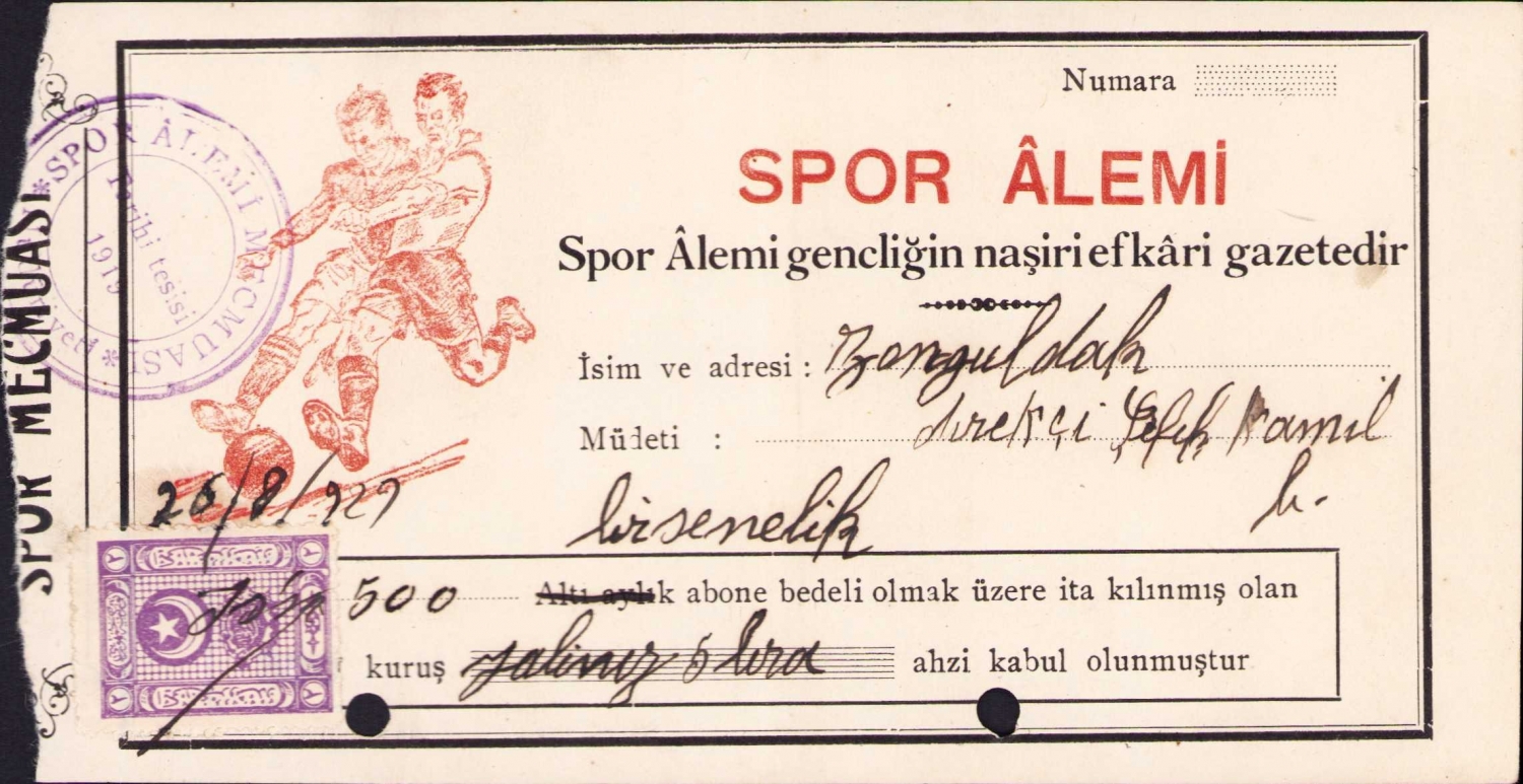 Spor Alemi 1929 tarihli makbuzu, 19x9 cm