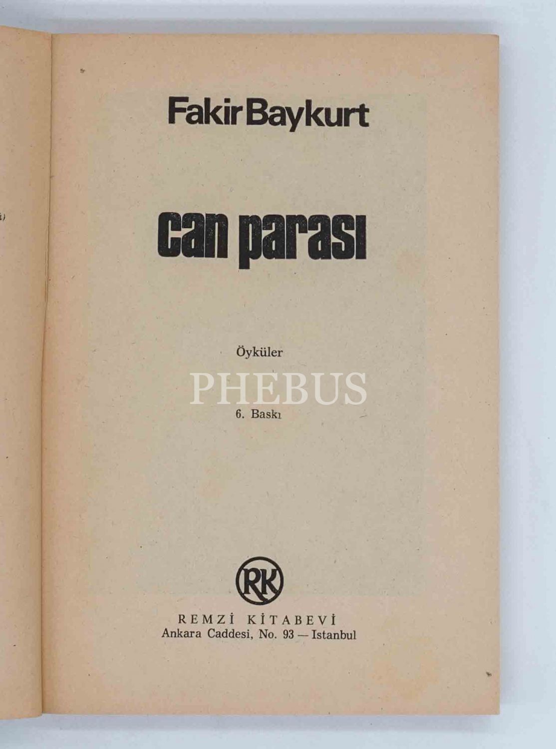 Fakir Baykurt´un 1974 Sait Faik Ödülü kazanan öykü kitabı: CAN PARASI, 1983 (Altıncı baskı), Remzi Kitabevi, 267 sayfa, 14x20 cm, İTHAFLI VE İMZALI...