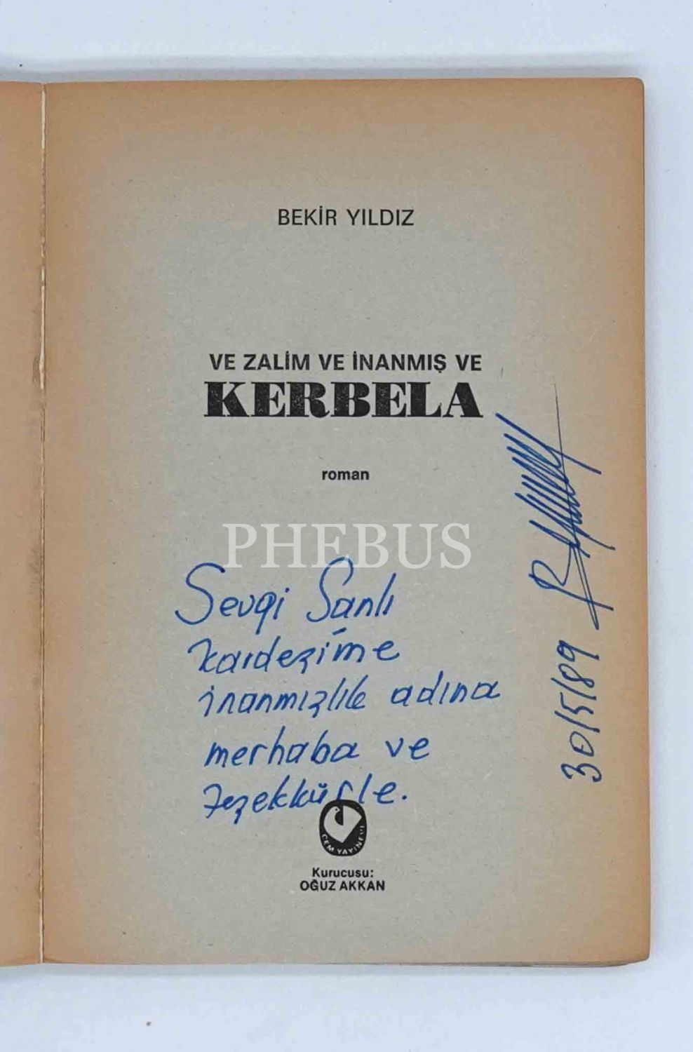 Öykü ve roman yazarı Bekir Yıldız´ın, İslam mitolojisini modern romana ustalıkla aktardığı eseri: VE ZALİM VE İNANMIŞ VE KERBELA, 1987 (Beşinci baskı), Cem Yayınevi, 158 sayfa, 14x20 cm, oyun yazarı, çevirmen ve eleştirmen Sevgi Sanlı´ya İTHAFLI VE İMZALI...