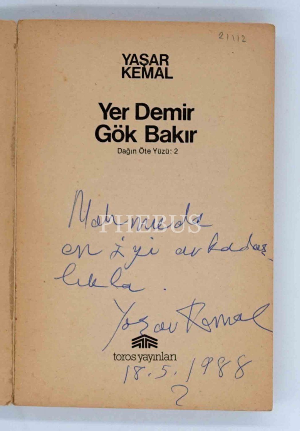 Yaşar Kemal´in dünyadaki ününü pekiştiren romanı: YER DEMİR GÖK BAKIR (Dağın Öte Yüzü: 2), 1995, Toros Yayınları, 403 sayfa, 13x19 cm, İTHAFLI VE İMZALI...