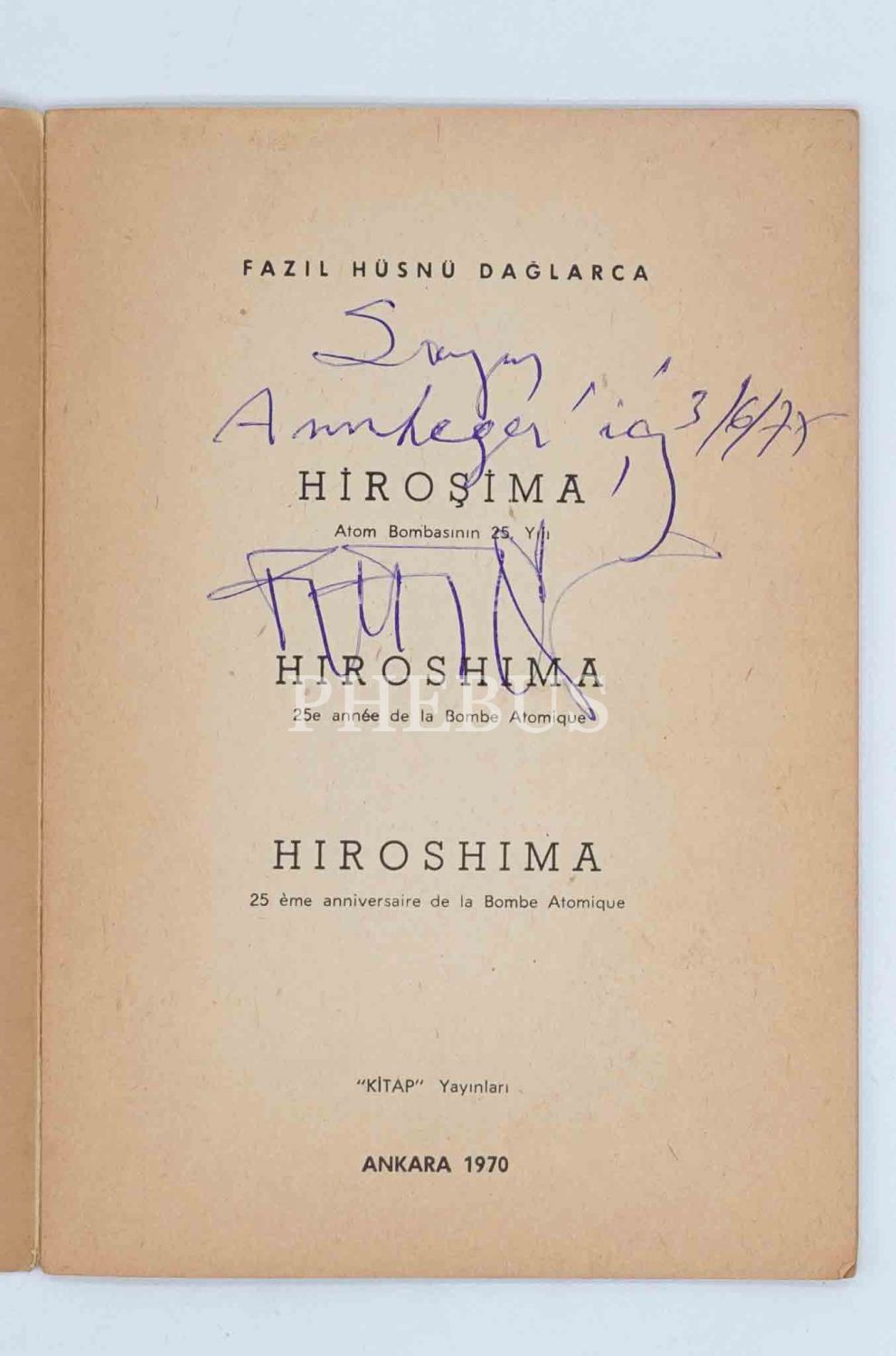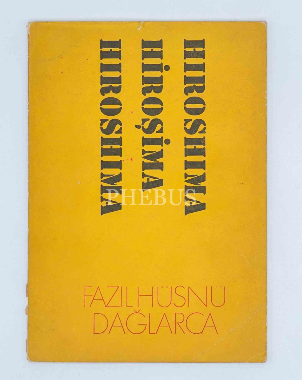 Modern Türk şiirinin en üretken şairlerinden Fazıl Hüsnü Dağlarca´nın, Hiroşima´ya atom bombası atılışının 25. yılında yayınladığı Türkçe, İngilizce ve Fransızca şiir kitabı: HİROŞİMA, 1970 (İlk baskı), Kitap Yayınları, 39 sayfa, 14x20 cm, İTHAFLI VE İMZALI...