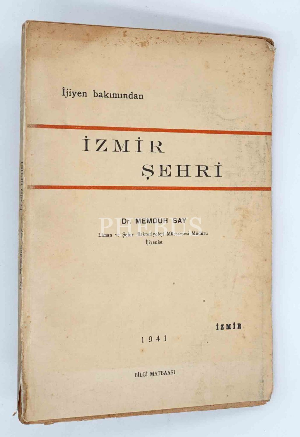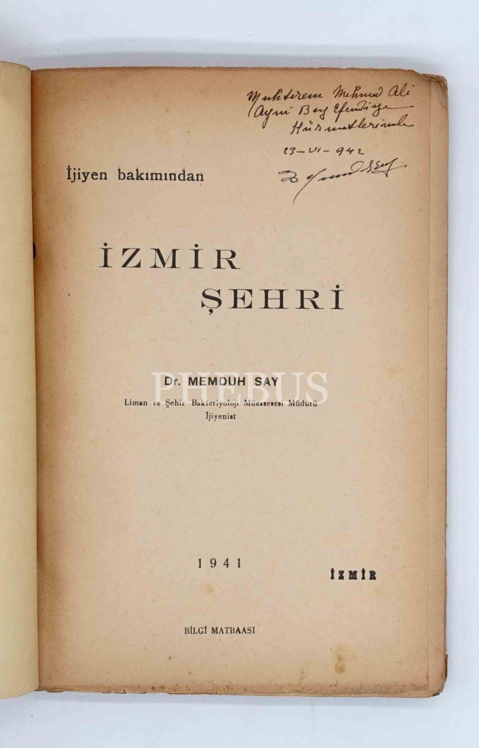 İJİYEN [Hijyen] BAKIMINDAN İZMİR ŞEHRİ, Dr. Memduh Say, 1941, Bilgi Matbaası (İzmir), 121 sayfa, 18x25 cm, mütefekkir ve bürokrat Mehmed Ali Ayni´ye İTHAFLI VE İMZALI...