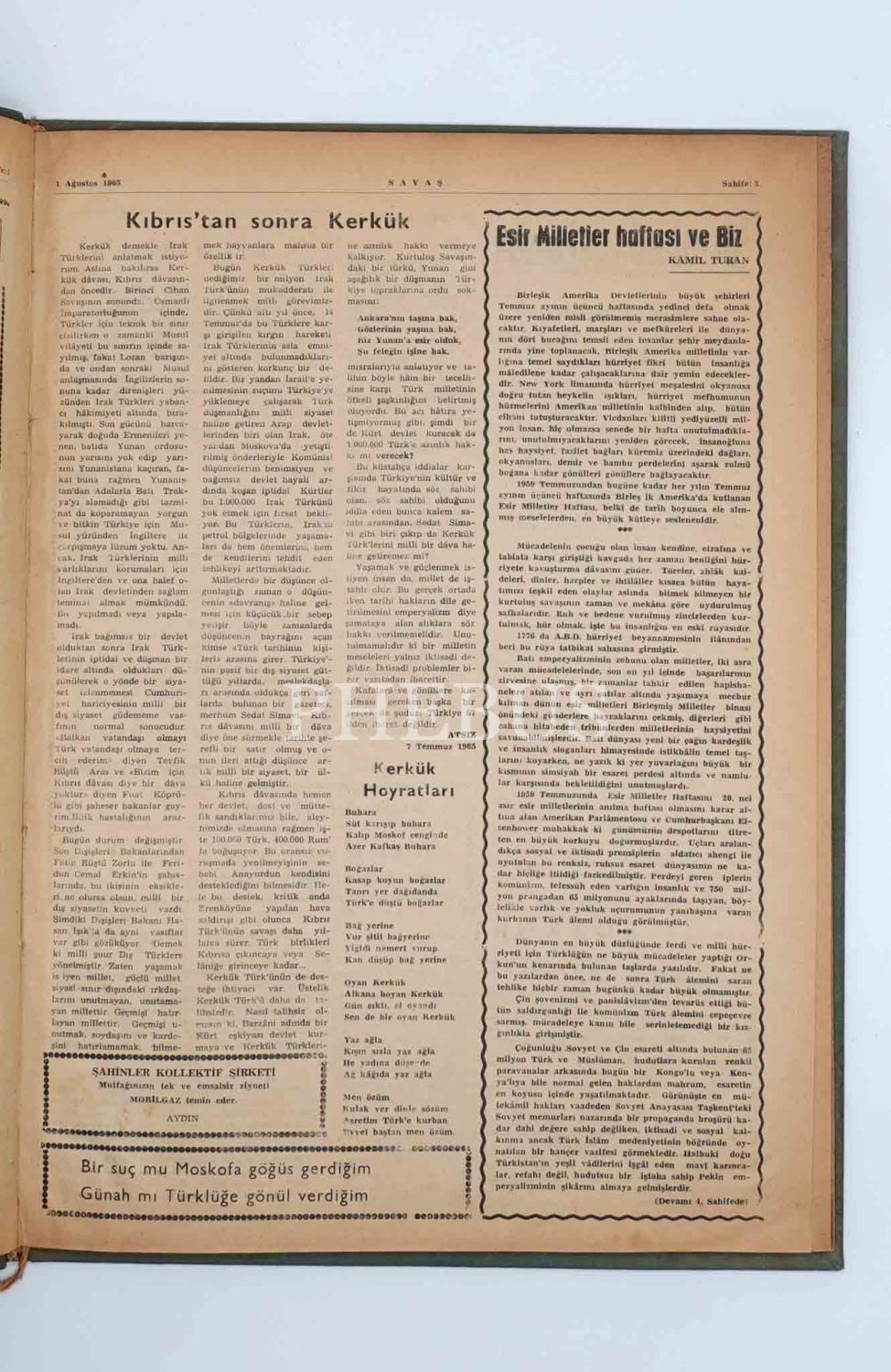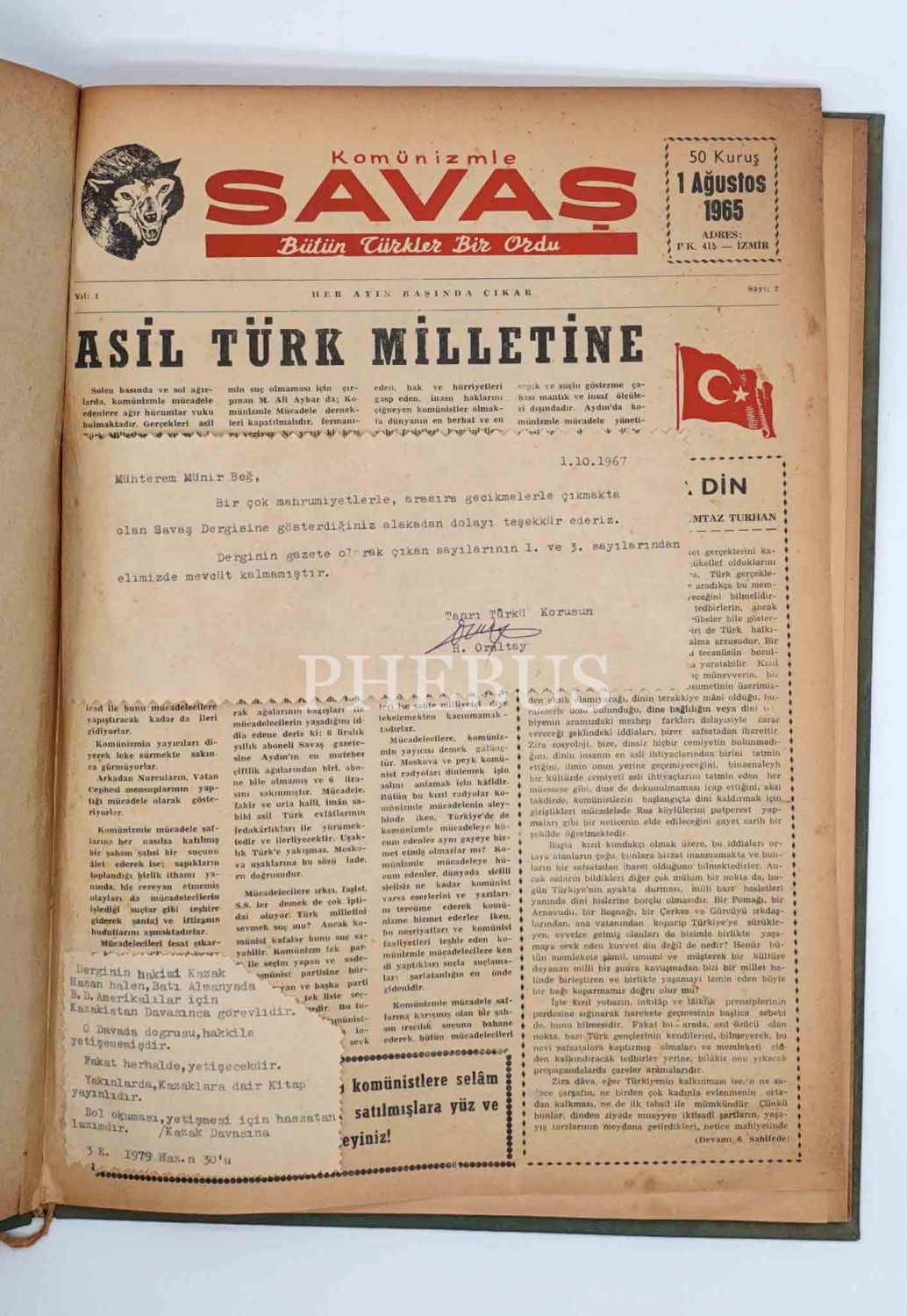"Her Ayın Başında Çıkar" Komünizmle SAVAŞ (Bütün Türkler Bir Ordu) dergisinin 1 Ağustos 1965 ilâ 1 Mart 1966 tarihleri arasında yayınlanan 2., 4., 5., 6., 7. ve 8. sayıları tek ciltte, 29x40 cm...