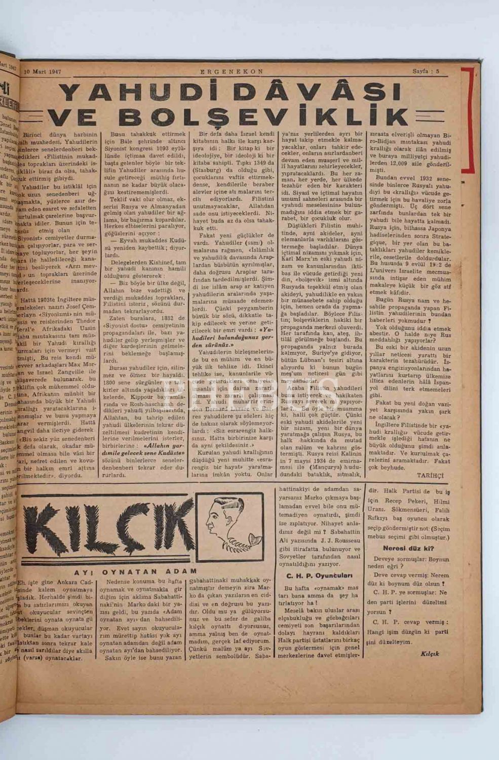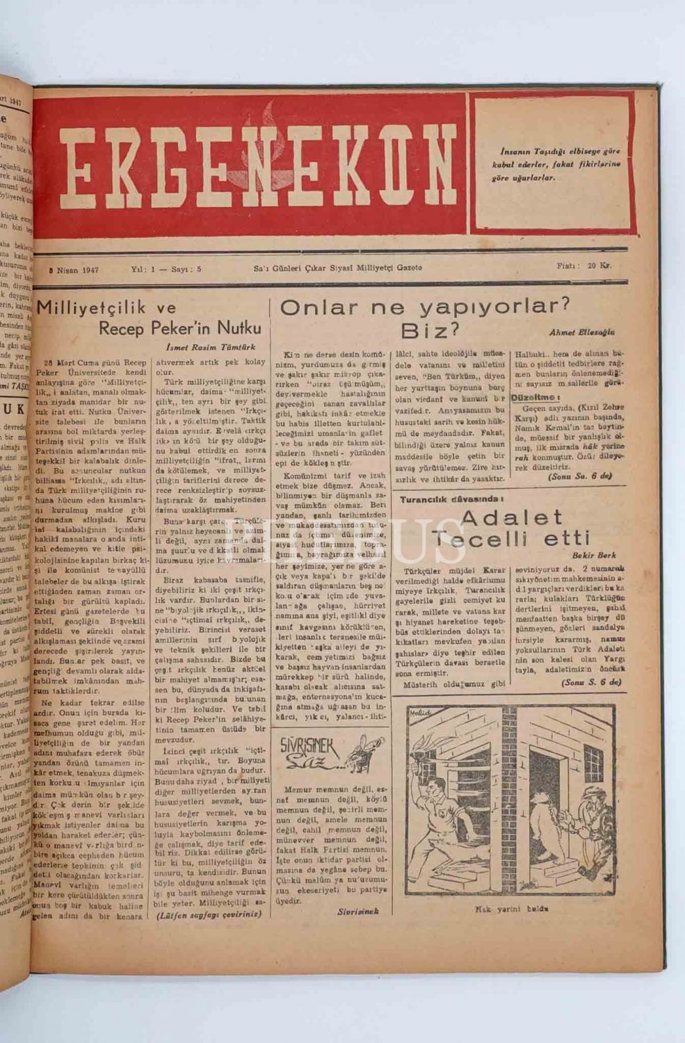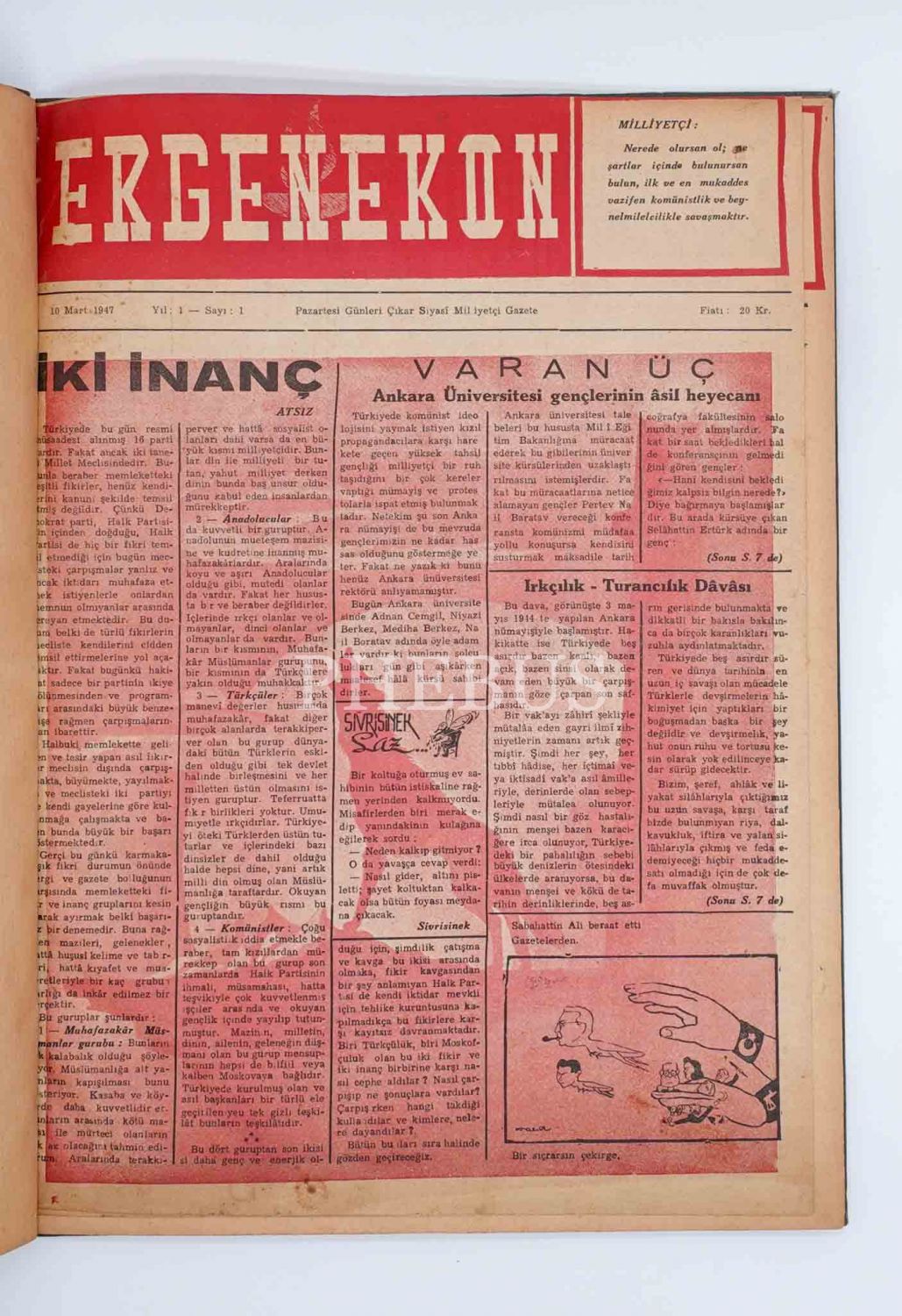 "Salı Günleri Çıkar Siyasî Milliyetçi Gazete" ERGENEKON´un 10 Mart 1947 ilâ 13 Mayıs 1947 tarihleri arasında yayınlanan ilk 10 sayısı tek ciltte, 30x41 cm...