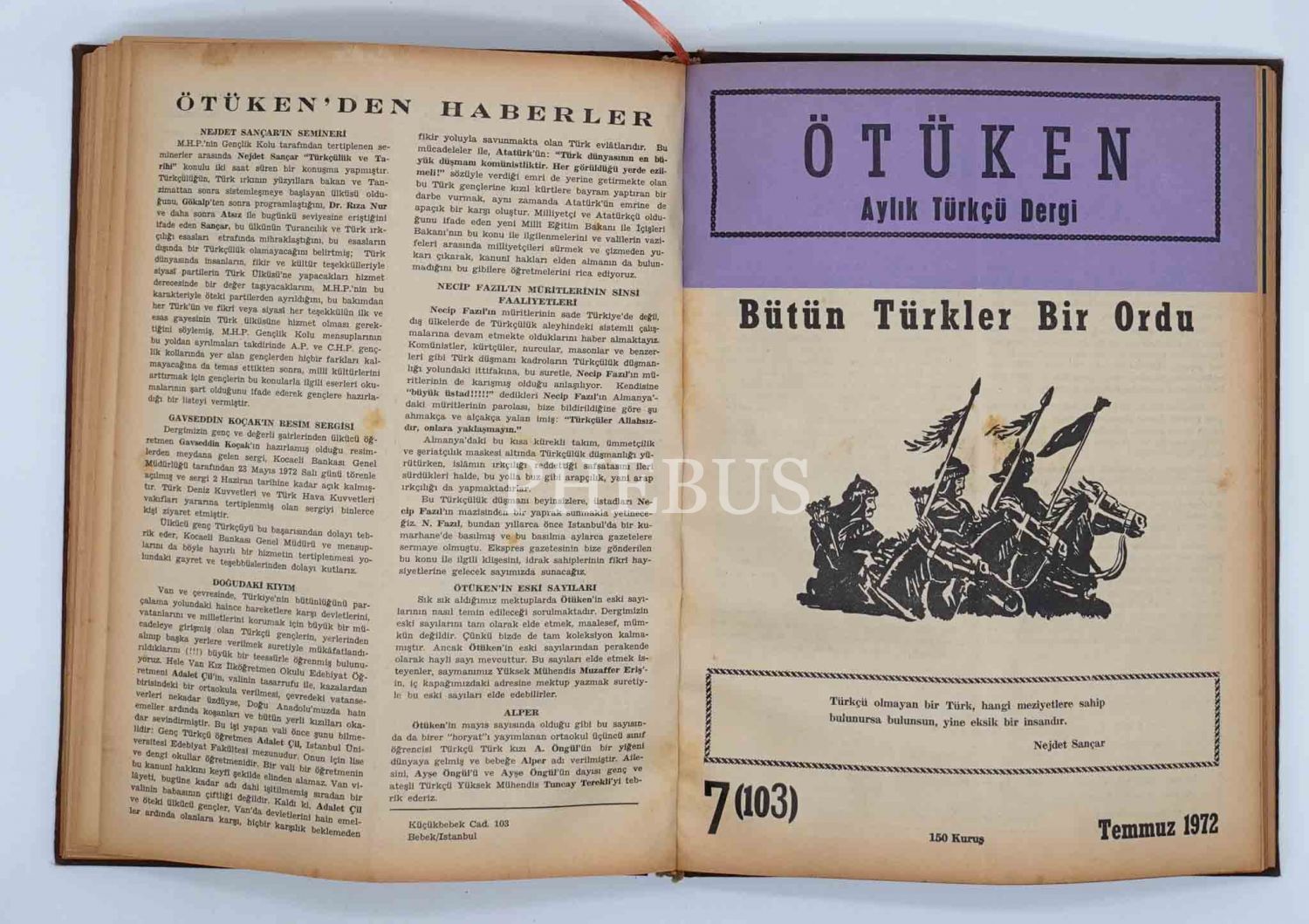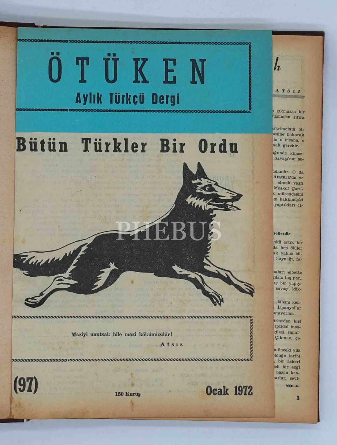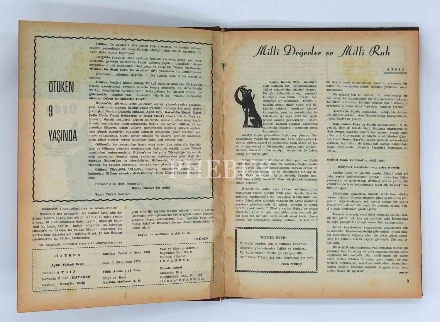 "Aylık Türkçü Dergi" ÖTÜKEN´in Ocak 1972 ilâ Aralık 1972 tarihleri arasında yayınlanan 12 sayısı (97-108) tek ciltte, 20x27 cm...