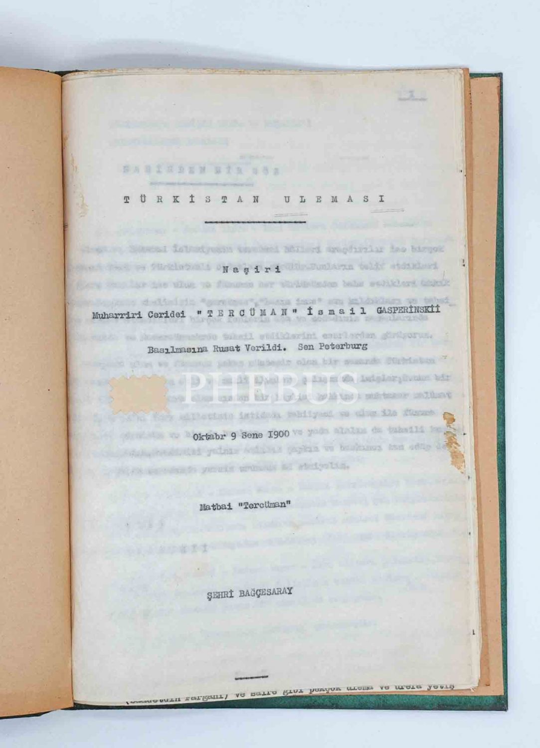 Kırım Tatarı fikir adamı, eğitimci ve yazar-yayıncı İsmail Gaspıralı´nın, Ukrayna´nın Bahçesaray ilçesinde basılan "Tercüman" gazetesine ek olarak 1900 tarihinde yayınlanan eserinin istinsahı: TÜRKİSTAN ULEMASI, 1973, 23 sayfa, 22x31 cm...