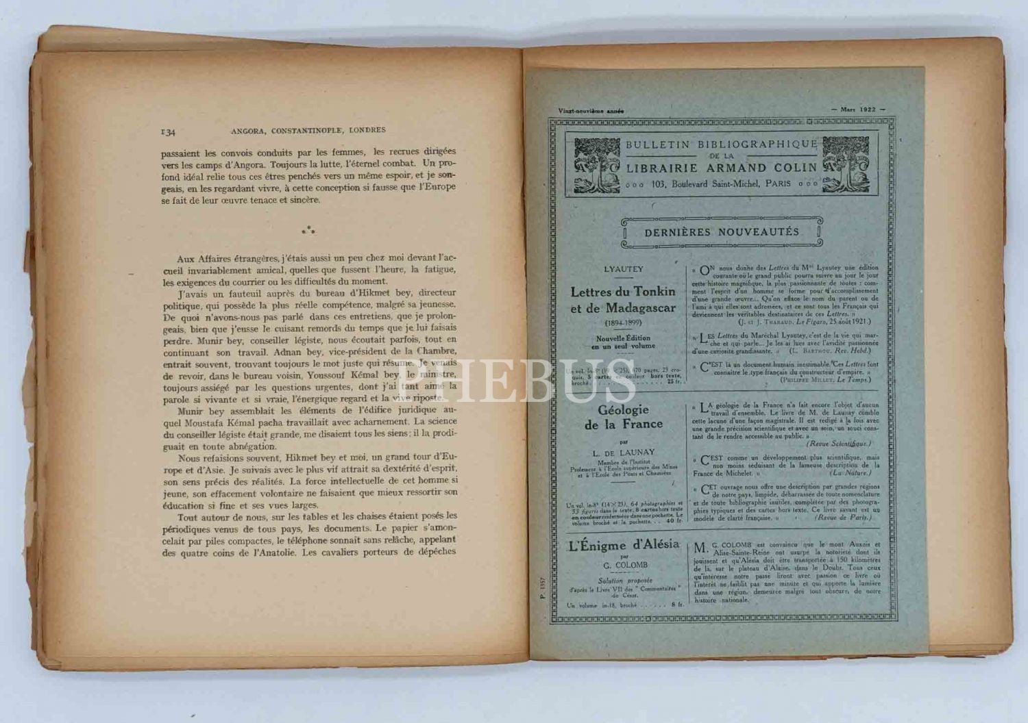 Atatürk´e hayran Fransız kadın gazeteci olan Berthe Georges-Gaulis´in kaleminden Mustafa Kemal´in (Atatürk) İngiliz politikası ve Ankara-İstanbul-Londra hattındaki güncel politik olaylar, ANGORA-CONSTANTINOPLE-LONDRES, 1922, Librairie Armand Colin, Paris, 257 sayfa, 19x24 cm...