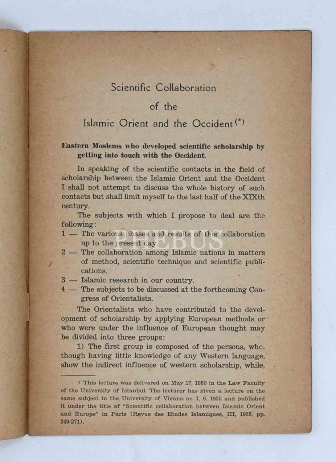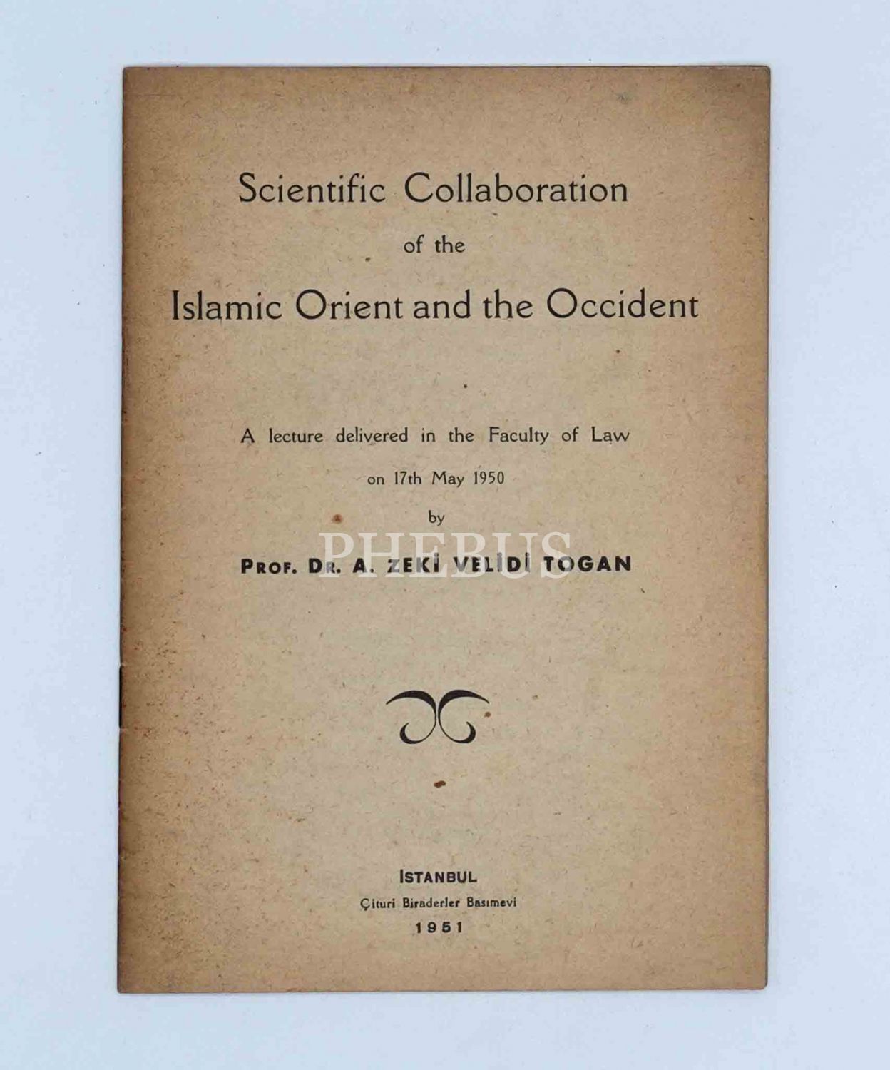 Zeki Velidi Togan´ın 17 Mayıs 1950 tarihinde Hukuk Fakültesi´nde verdiği "İslami Doğu ve Batı´nın Bilimsel İşbirliği" başlıklı konferansının İngilizce metni, 1951, Çituri Biraderler Basımevi, 26 sayfa, 14x20 cm...