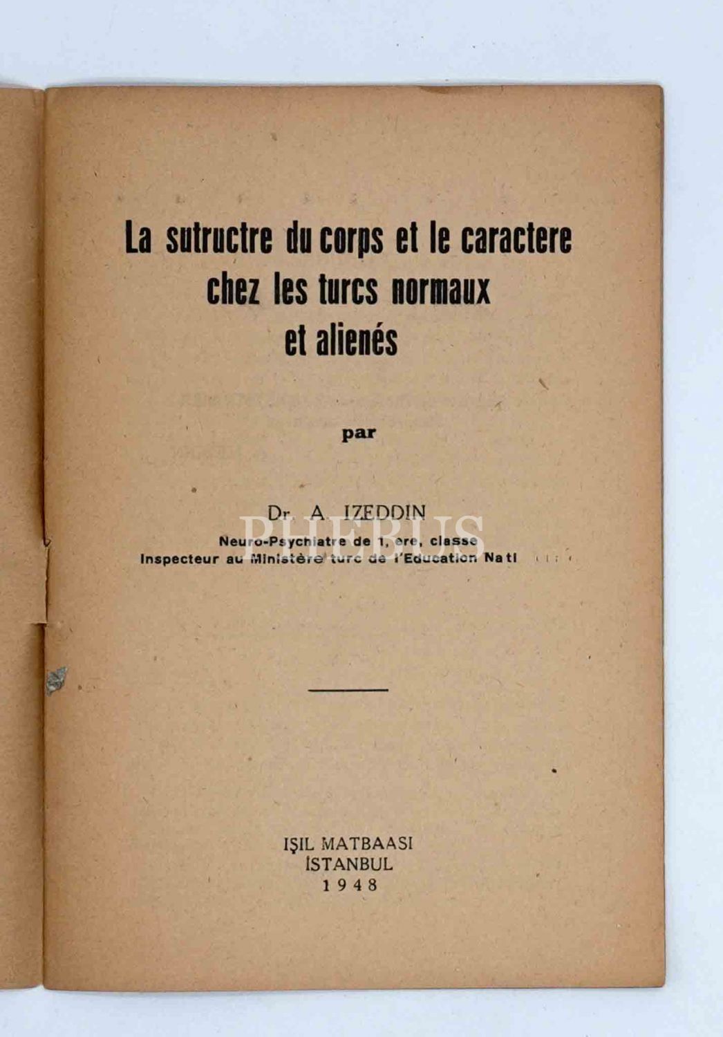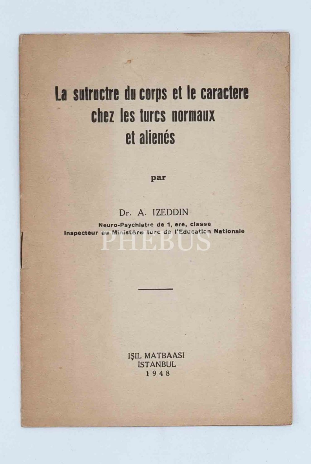LA SUTRUCTRE DU CORPS ET LE CARACTERE CHEZ LES TURCS NORMAUX ET ALIENES (Normal ve yabancı Türklerde vücut yapısı ve karakter), Dr. A. Izeddin, 1948, Işıl Matbaası, İstanbul, 26 sayfa, 14x20 cm...