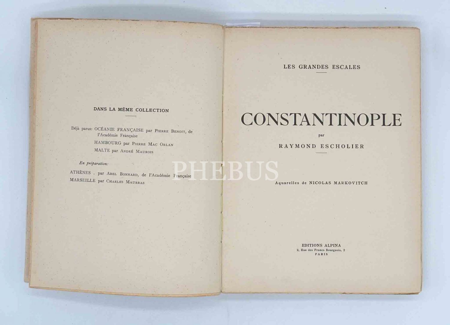 Fransız gazeteci, yazar ve sanat eleştirmeni Raymond Escholier´in edebi üsluplu renkli anlatımı ve Nicolas Markovitch´in İstanbul konulu suluboya resimleriyle renkli bir İstanbul seyahatnamesi: CONSTANTINOPLE, 1935, Editions Alpina, Paris, 152 sayfa, 17x22 cm...