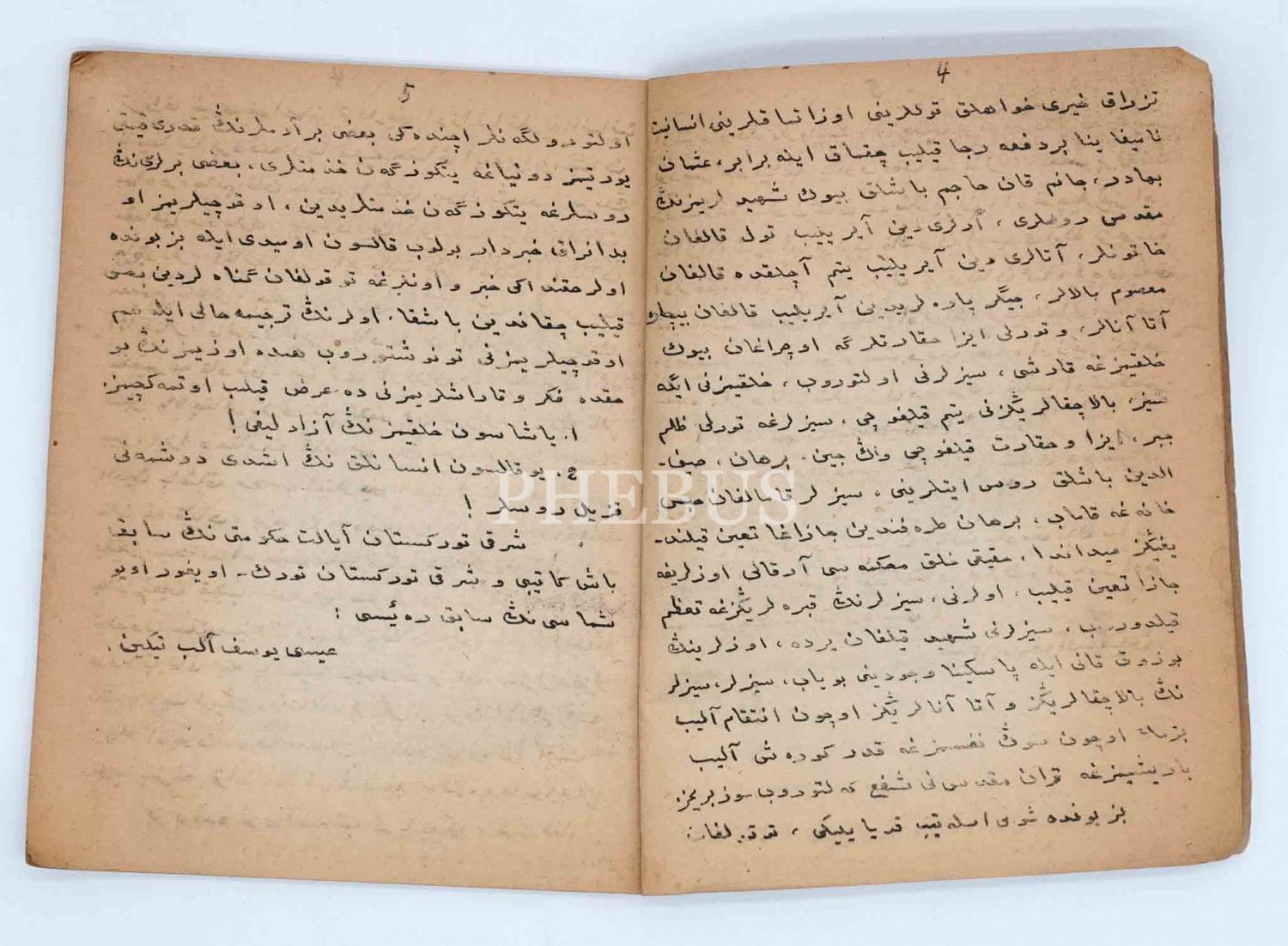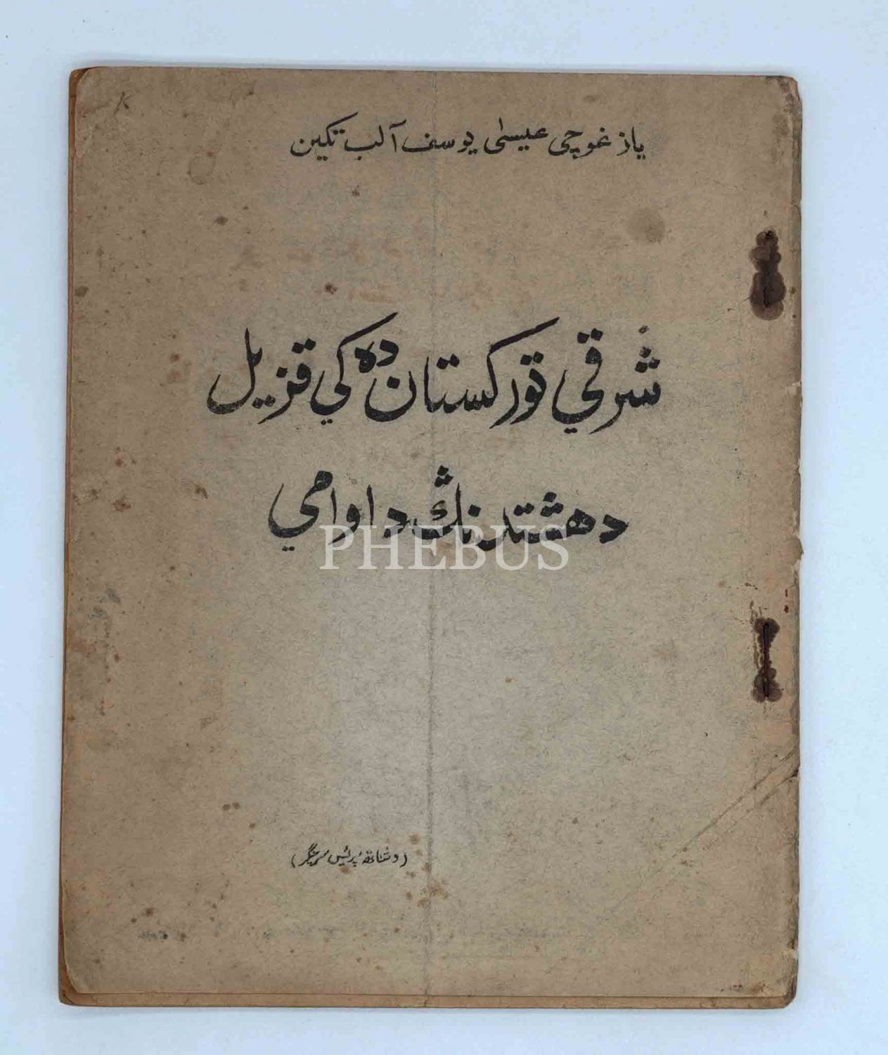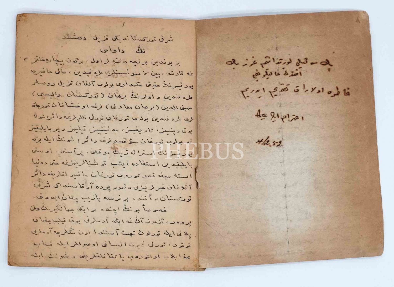 Muhtemelen illegal olarak basılmış olan kitapçık, "Pek sevgili ...daşım Aziz Bey Efendi âlilerine hatıra olarak takdim ederim." ibaresiyle, Doğu Türkistan´ın milli lideri İsa Yusuf Alptekin tarafındn imzalanmış. Özege kataloğunda yok.