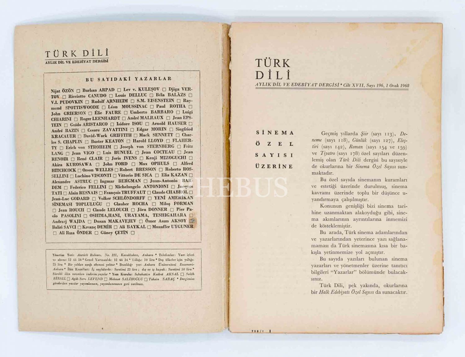 "Aylık Dil ve Edebiyat Dergisi" TÜRK DİLİ´nin Ocak 1968 tarihli "Sinema Özel Sayısı" (Sayı: 196), 289 sayfa, 17x25 cm...