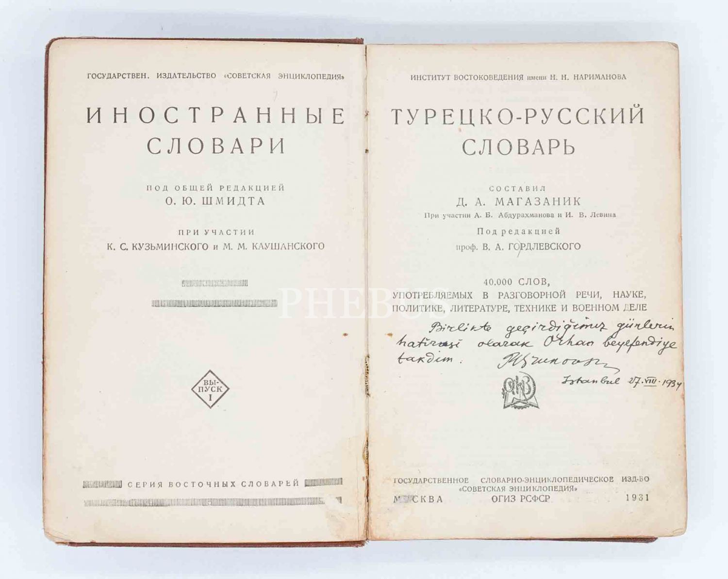 TÜRKÇEDEN RUSÇAYA LÛGAT, D. A. Magazanik, 1931, 1174 sayfa, 12x17 cm, İTHAFLI VE İMZALI...