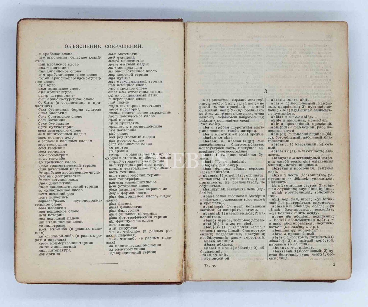 Konuşma, bilim, siyaset, edebiyat, teknoloji ve askeri alanlarda kullanılır 40.000 kelimeyi havi Türkçe-Rusça sözlük. İlk sayfasında Türkçe-Rusça "Bu eser büyük sosiyalist kuruluşumuza ithaf olunur." ifadesi yer almaktadır. Künye sayfasında yer alan Türkçe ithafın kim tarafından kaleme alındığı tespit edilemiştir. İthaf, "Birlikte geçirdiğimiz günlerin hatırası olarak Orhan beyefendiye takdim. ?, İstanbul, 27.VIII.1934" şeklindedir.