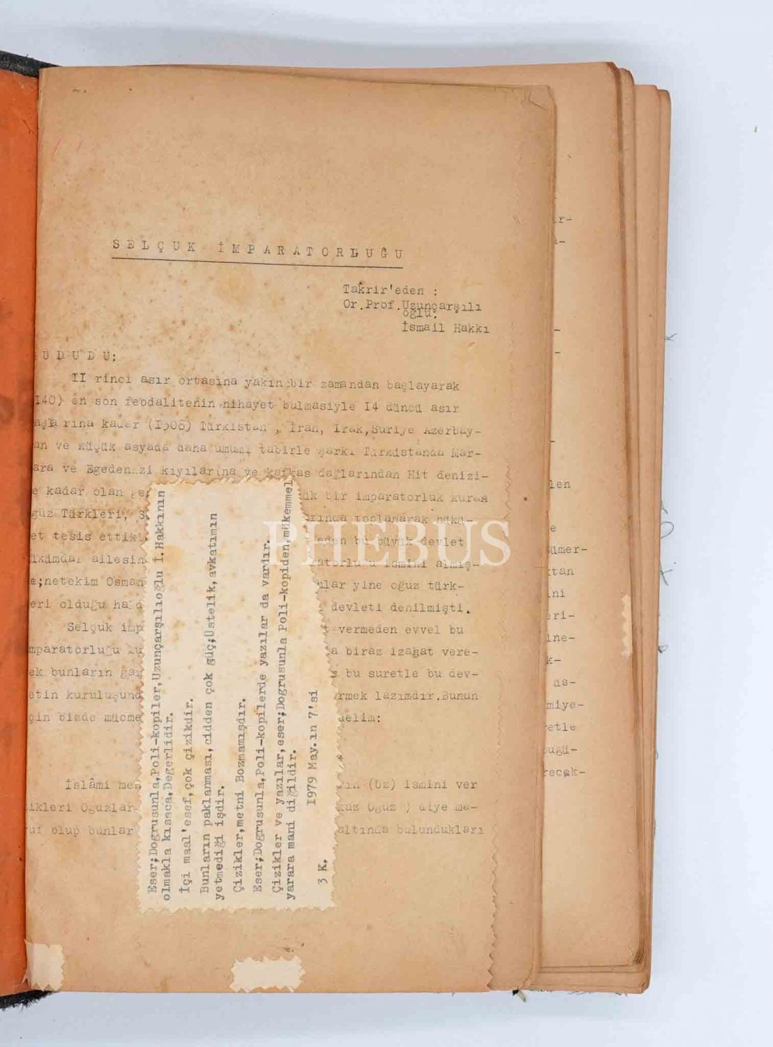 İsmail Hakkı Uzunçarşılı´nın kitap olarak yayınlanmamış "Selçuk İmparatorluğu" konulu ders notlarının daktilo ile bir araya getirildiği derleme, 278 sayfa, 20x32 cm...