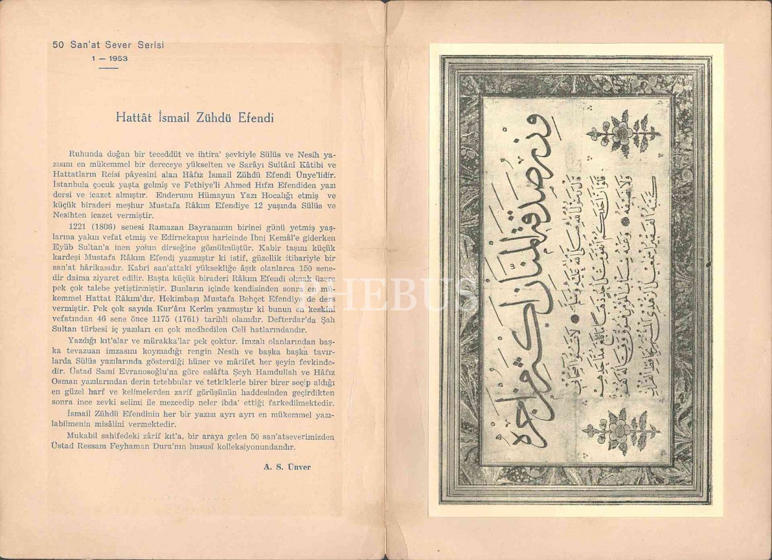 "HATTAT İSMAİL ZÜHDÜ EFENDİ" başlıklı 50 Sanat Sever Serisi´nin 1953 tarihli 1 numaralı sayısı, A. Süheyl Ünver, 2 sayfa, 17x25 cm...