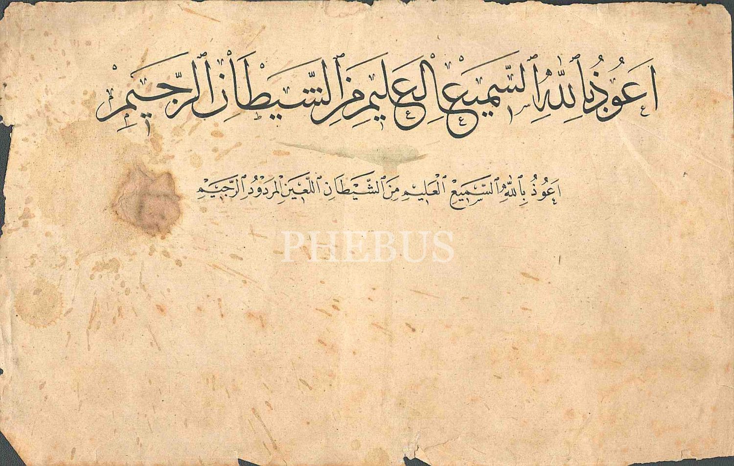 Hoca işi sülüs-nesih istiaze, “Eûzü billahis-semîil alîm-i mineşşeytânirracîm”, 25x16 cm...