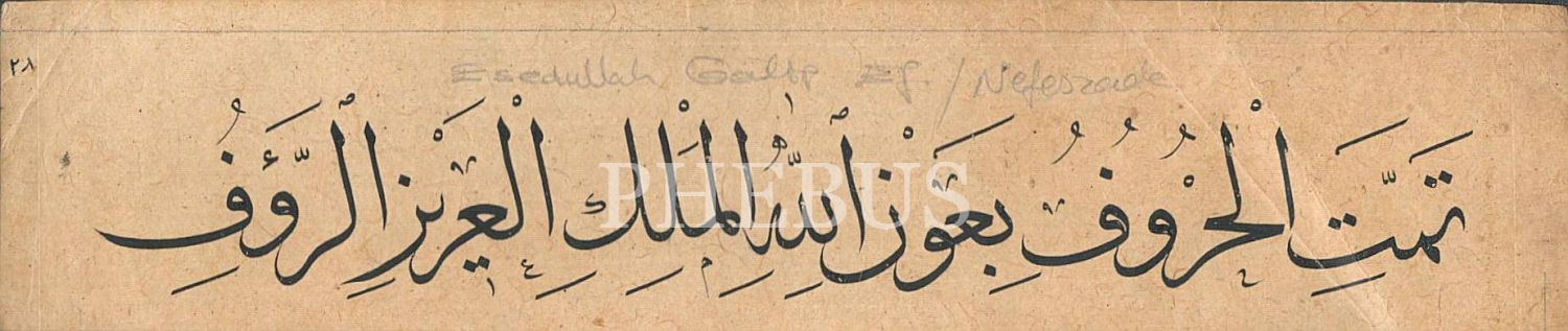 Anlamı "Aziz, Melik ve Rauf olan Allah´ın yardımıyla harfler tamamlandı." şeklindedir. Üzerinde yer alan osmanlıca notta "Nefeszade" yazılıdır.