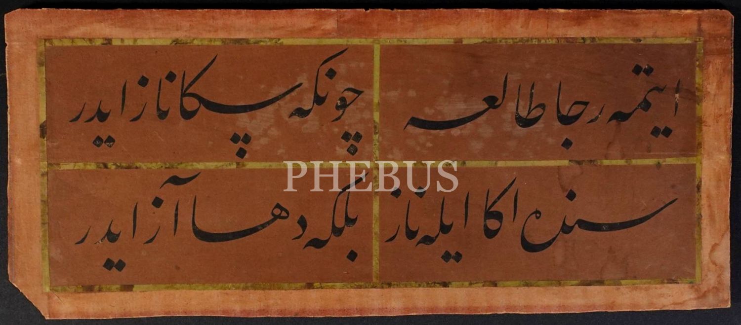 Celi talik şiir, "Etme recâ tâli´e çünkü sana nâz eder/ Sen de ona eyle naz bil ki daha az eder", 52x22 cm...