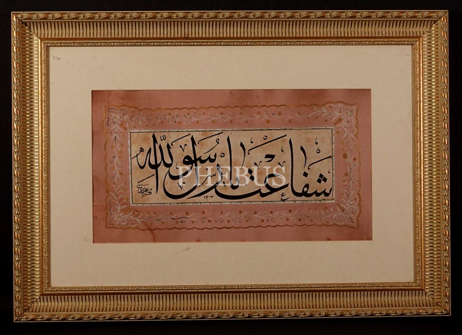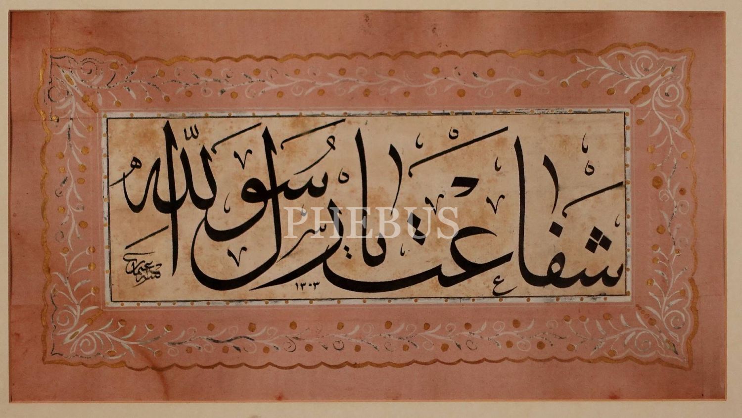 Osman ketebeli celi-sülüs levha, "Şefaat ya resulallah", 1303, çerçeve: 75 cm, yazı: 35x12 cm...
