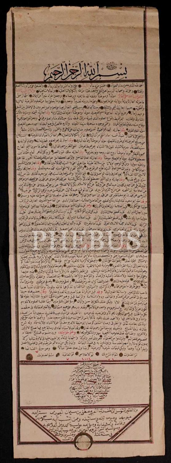 Çorumlı Süleyman oğlu Mustafa Hilmi´nin tarafından öğrencisi Çorumlu Ahmet Hilmi´ye verdiği icazetnâme, 1323, 20x57 cm...