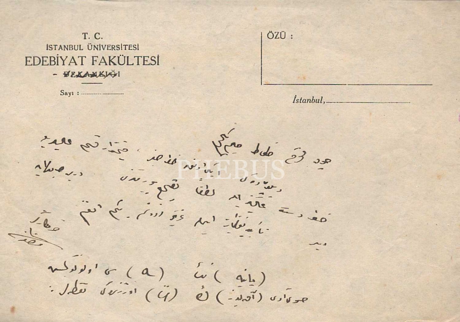 T.C. İstanbul Üniversitesi Edebiyat Fakültesi antetli Mustafa Halim Özyazıcı´ya gönderilen, hazırladığı diplomalarda bulunan bazı hataların düzeltilmesi hususunda yazılmış iş mektubu, 20x14 cm...