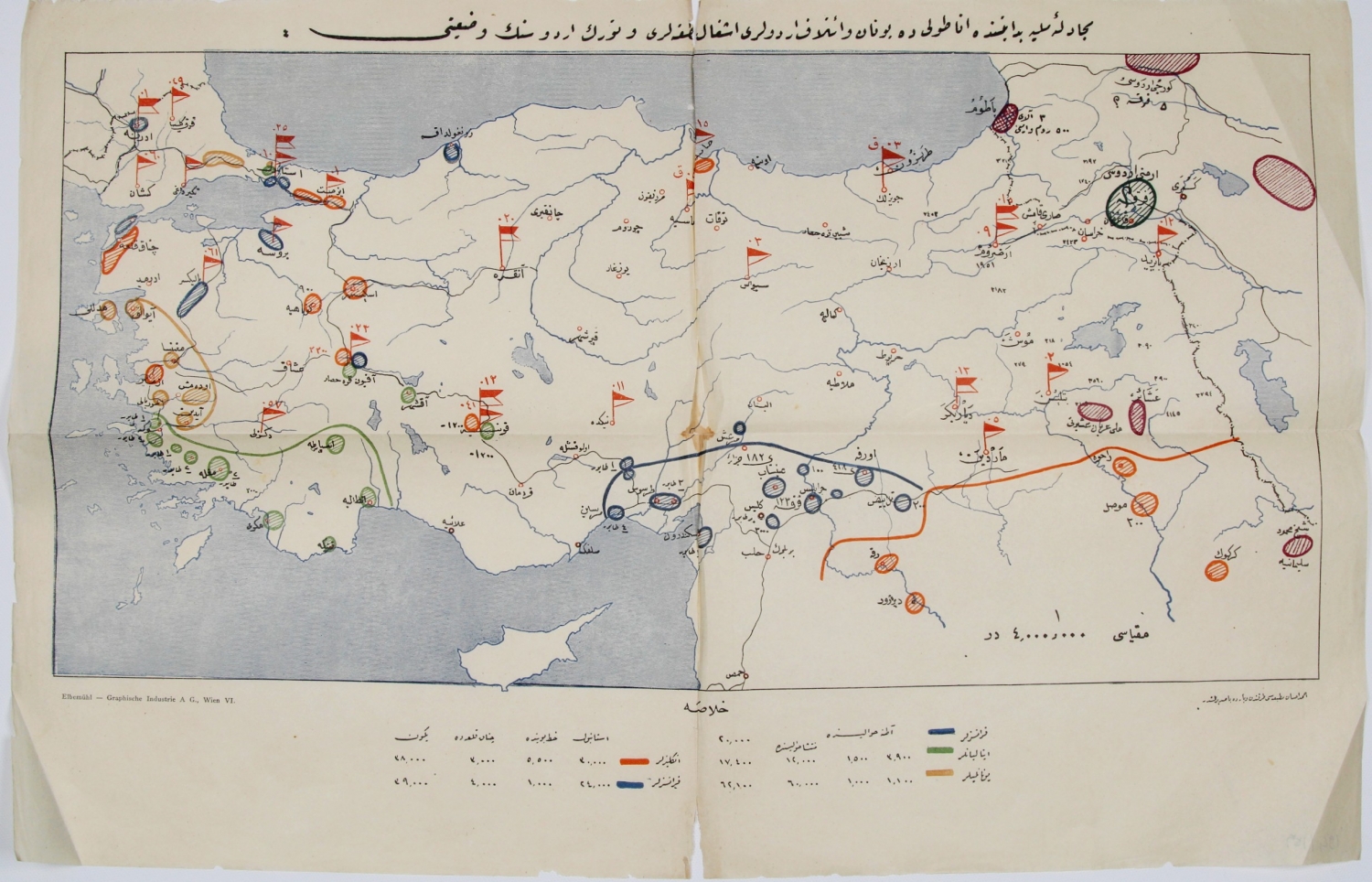 Osmanlıca Mücadele-i Milliye Bidayetinde Anadoluda Yunan orduları işgal noktaları ve Türk ordusunun vaziyetine dair harita, 32x47 cm