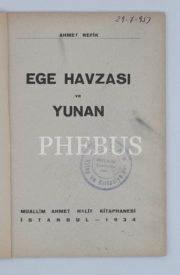EGE HAVZASI VE YUNAN, Ahmet Refik, 1934, Muallim Ahmet Halit Kitaphanesi, 52 sayfa...