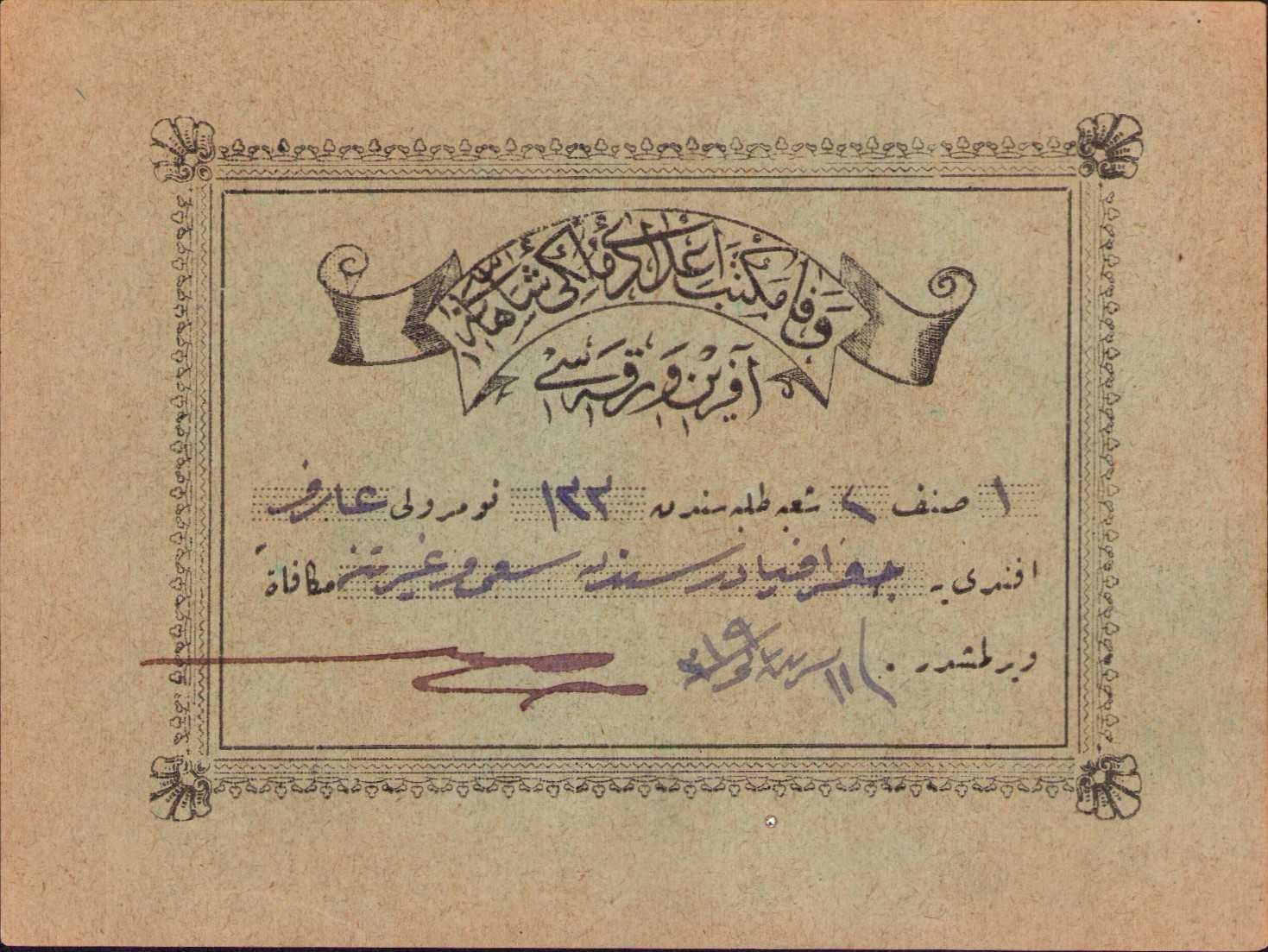 Osmanlıca Aferin, Vefa Mektebi İdadisi MüLki Şahanesi, 9x12 cm