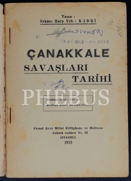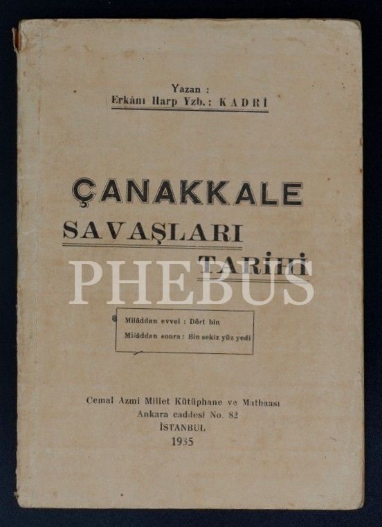 ÇANAKKALE SAVAŞLARI TARİHİ, Kadri, 1935, Cemal Azmi Millet Kütüphane ve Matbaası, 93 sayfa...