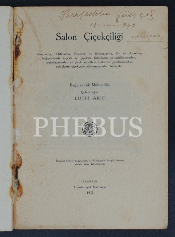 SALON ÇİÇEKCİLİĞİ, Lütfi Arif, 1931, Agah-Sabri Kitaphanesi, 131 sayfa...
