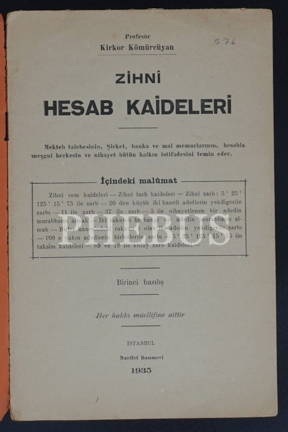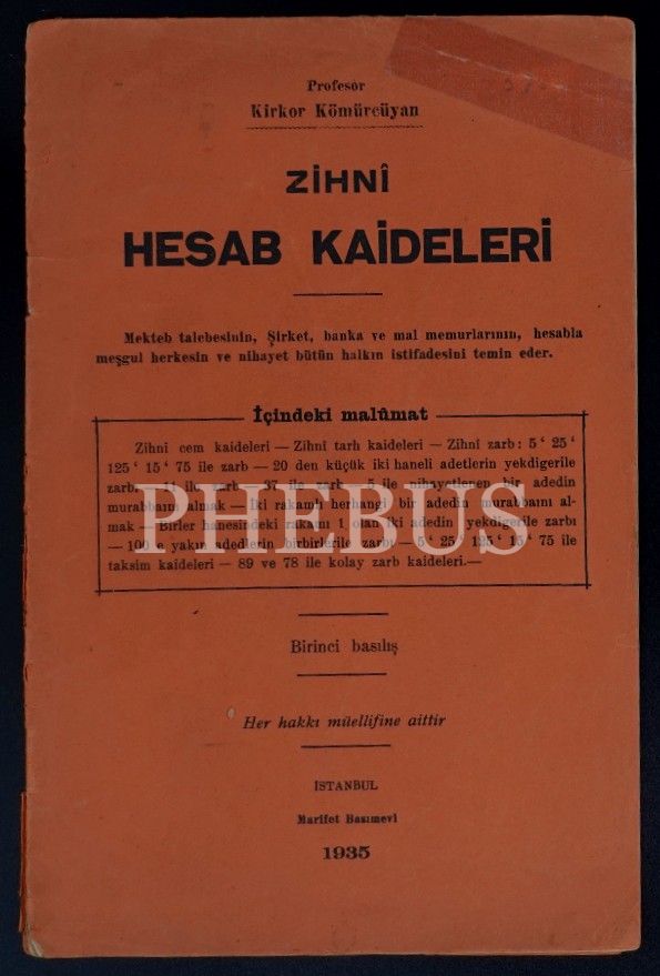 ZİHNİ HESAB KAİDELERİ, Kirkor Kömürcüyan, 1935, Marifet Basımevi, 16 sayfa...
