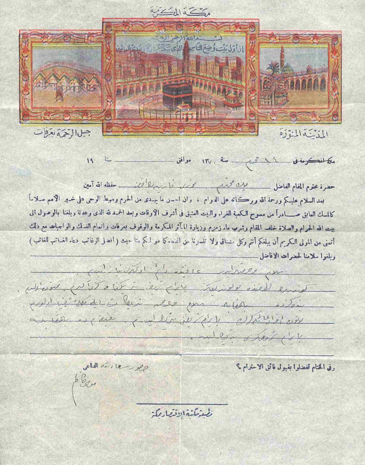 Medine-i Münevvere'den Nuri Beyefendiye gönderilen Mekke-i Mükerreme, Medine-i Münevvere ve Arafat Dağı görselli, 1370 tarihli bayram tebrik mektubu, Matbaa-i Mekkiyyetü'l İktisad, 22x28 cm...