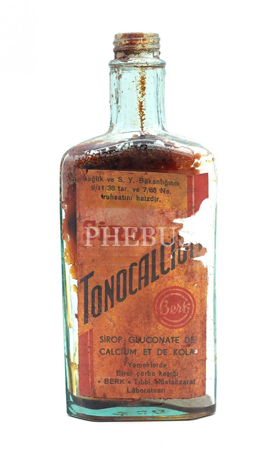 Sirop Tonocalcium şişesi (boş), Berk Tıbbî Müstahzarat Lâboratuarı, 1938 ruhsatlı, 7x16x4 cm...