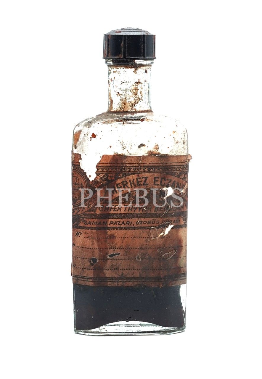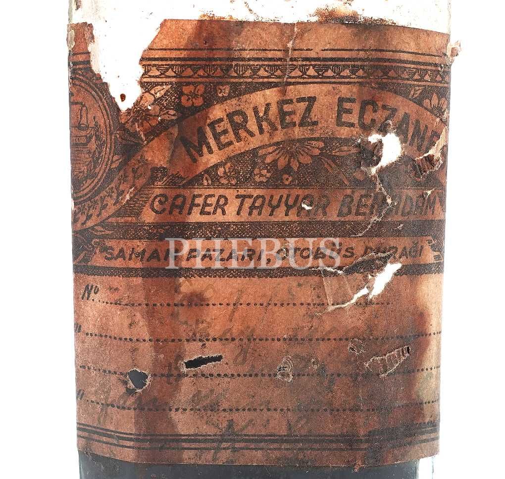 Merkez Eczanesi (Cafer Tayyar) etiketli ilaç şişesi (yarısından azı dolu), 14x5x3 cm...