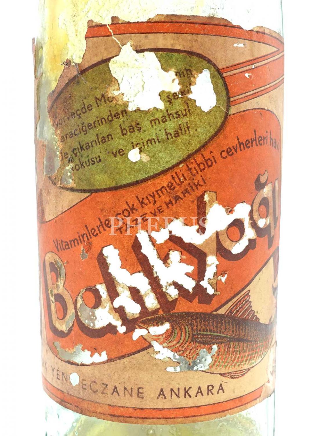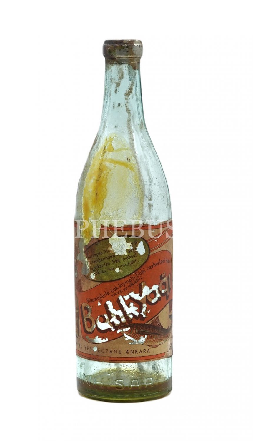 "Vitaminlerle çok kıymetli tıbbî cevherleri havi taze ve hakiki Balık Yağı"... Etiketi yıpranmış haliyle.