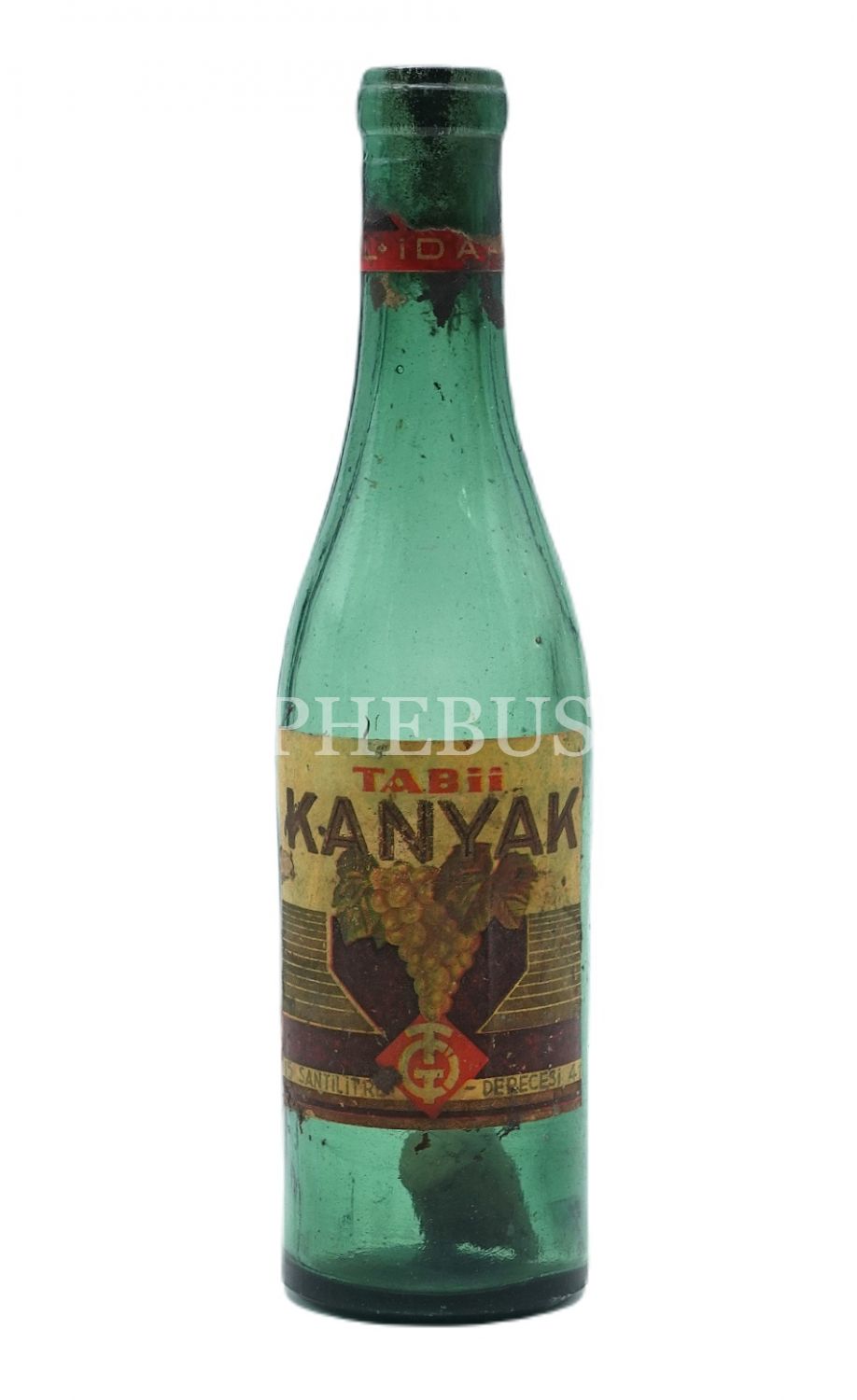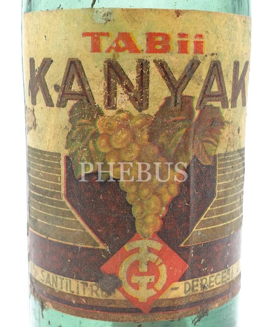 Tekel mamulatı, kabartma yazılı ve Tabii Kanyak etiketli boş kanyak şişesi, 19x5 cm...